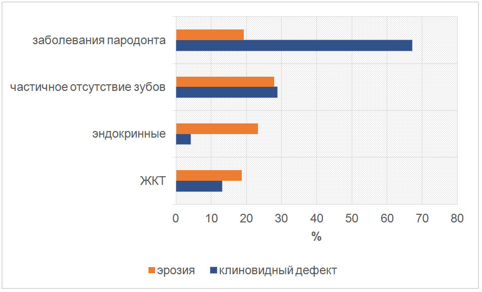 Согласно данным, зафиксированным в амбулаторных картах обследованных пациентов, основными факторами риска развития данной патологии являются заболевания пародонта – 86,4 % и частичное отсутствие зубов (в результате удаления) – 56,7 %, эндокринная патология –27,5 %, заболевания ЖКТ – 31,8 %. Зачастую влияние этих факторов имело сочетанный характер. Более детальный анализ показал, что у лиц с эндокринными заболеваниями и патологией ЖКТ диагноз «эрозия зубов» встречался чаще, а «клиновидный дефект» больше был распространен среди пациентов с заболеваниями пародонта, частичным отсутствием зубов, то есть на фоне анатомо-функциональных изменений челюстно-лицевой области (рис. 2).