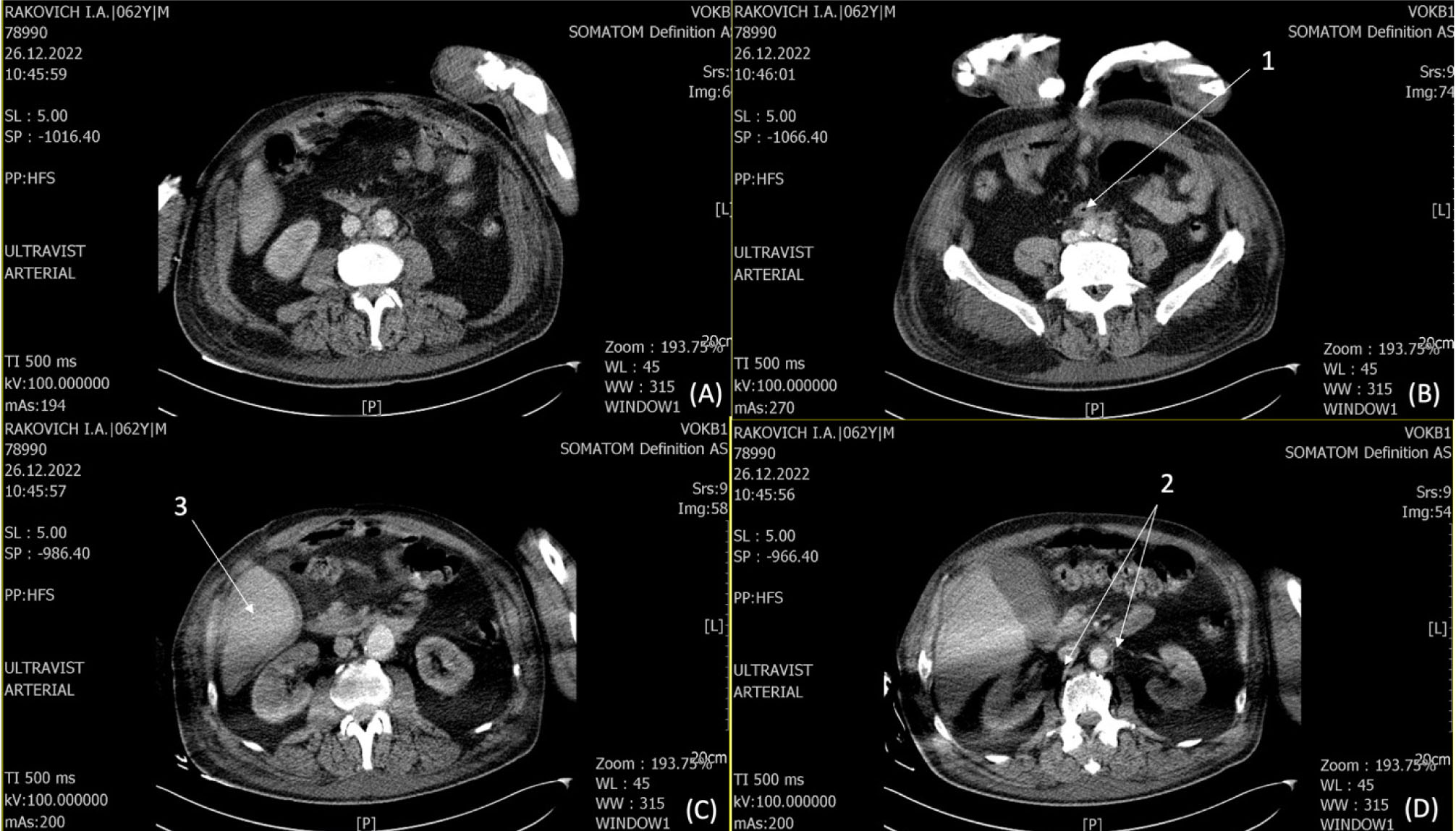 Рис. 2. КТА брюшной аорты и подвздошных сосудов – картина, характерная для ложной аневризмы с деструктивными воспалительными изменениями окружающей клетчатки (формирующийся абсцесс) (C). Не исключается парааортальный воспалительный процесс на уровне бифуркации за счет пакета увеличенных лимфатических узлов (A, B, D). Субокклюзия глубокой и поверхностной бедренных артерий справа