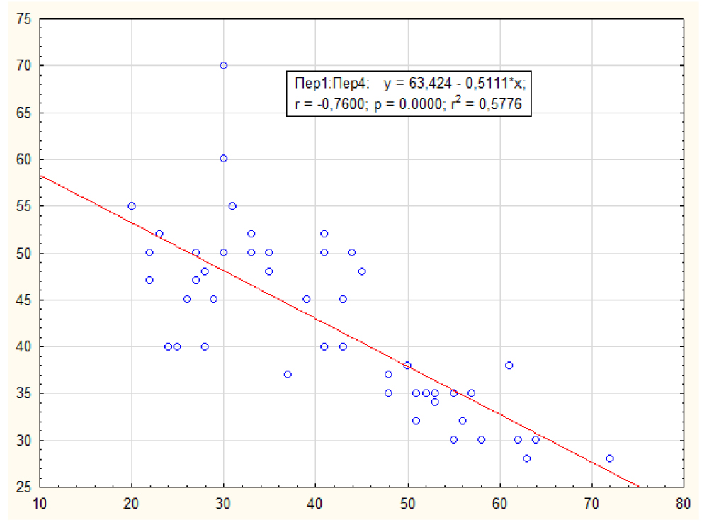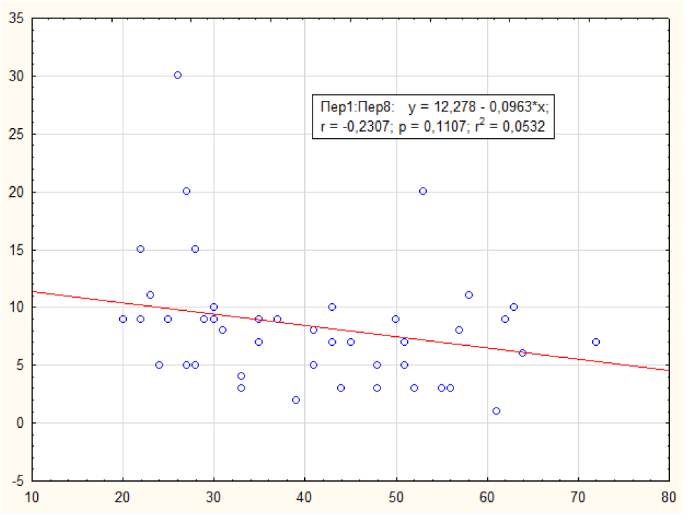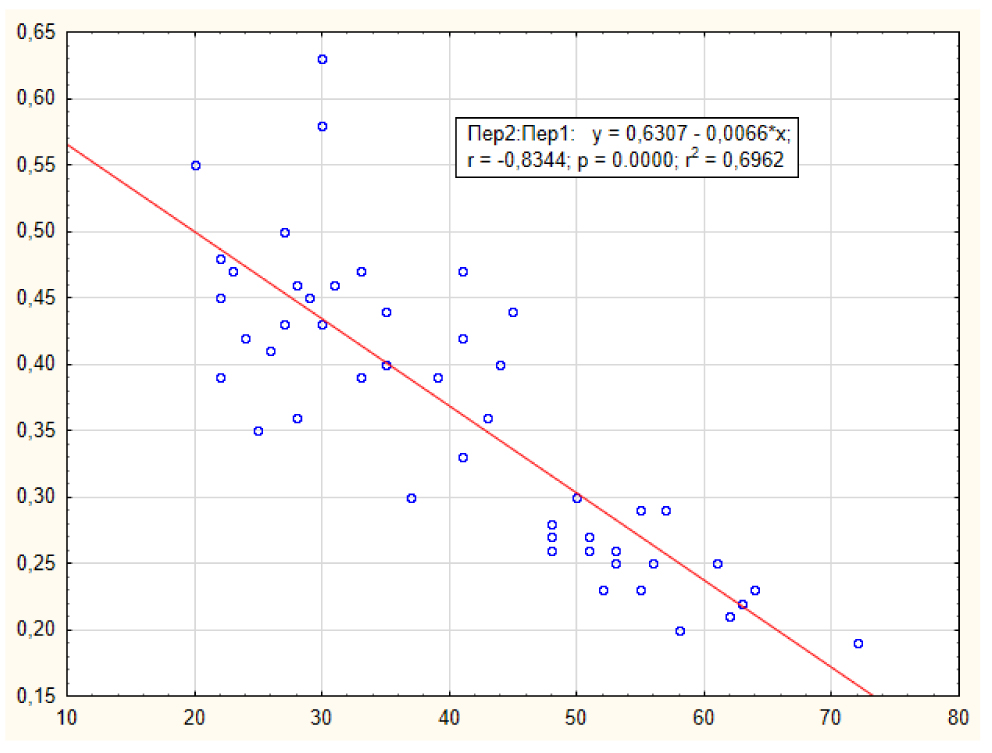 Отмечалась сильная корреляционная связь; коэффициент корреляции (r x/y) был равен 0,83. Установленная зависимость позволит в каждом конкретном случае оценивать влияние возраста на состояние палисад лимбальной зоны по данным ОКТ переднего сегмента глаза.