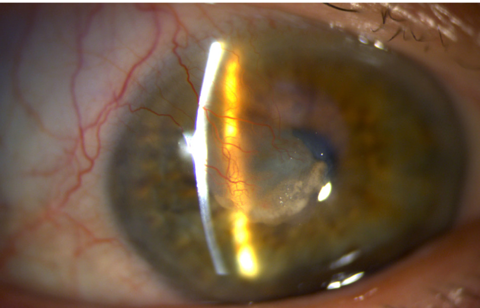 Рис. 1. Биомикроскопическая картина пациента с бетагерпетическим кератитом: субэпителиальный инфильтрат с нарушением эпителизации, активная неоваскуляризация; особенности инфильтрата – имеет четкие интенсивные границы, берет начало от лимба