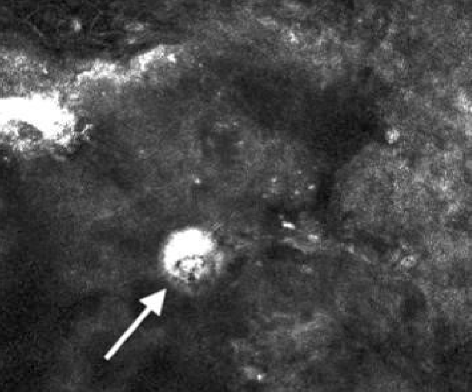Рис. 2. Конфокальная микроскопия пациента с бетагерпетическим кератитом. Клетка по типу «совиного глаза» на глубине 30 мкм. 400 × 400 мкм