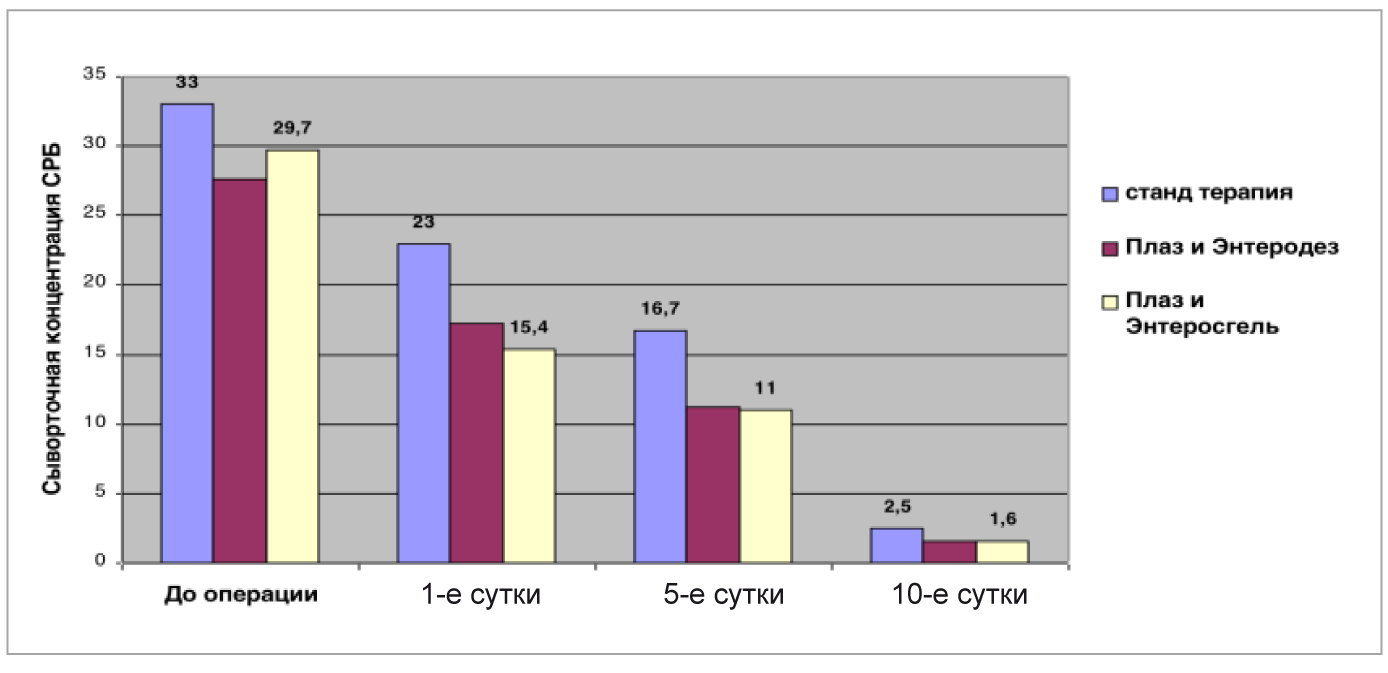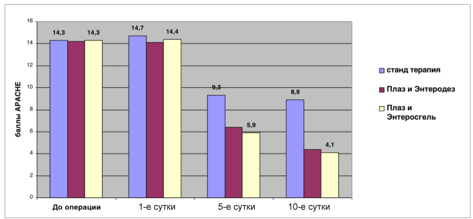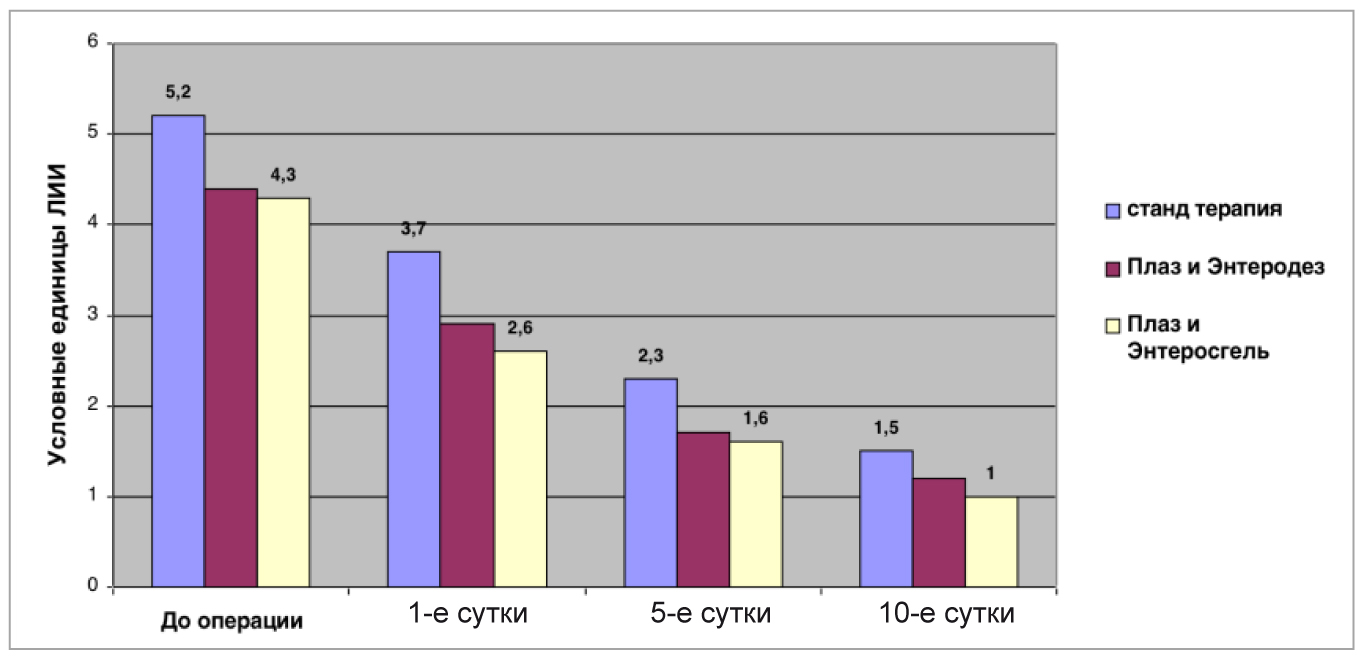 Эффективность проводимого лечения оценивалась по результатам лабораторных исследований ЛИИ, МСМ, СРБ, интегральным шкалам APACHE II и SOFA на 1-е, 5-е и 10-е сутки послеоперационного периода.
