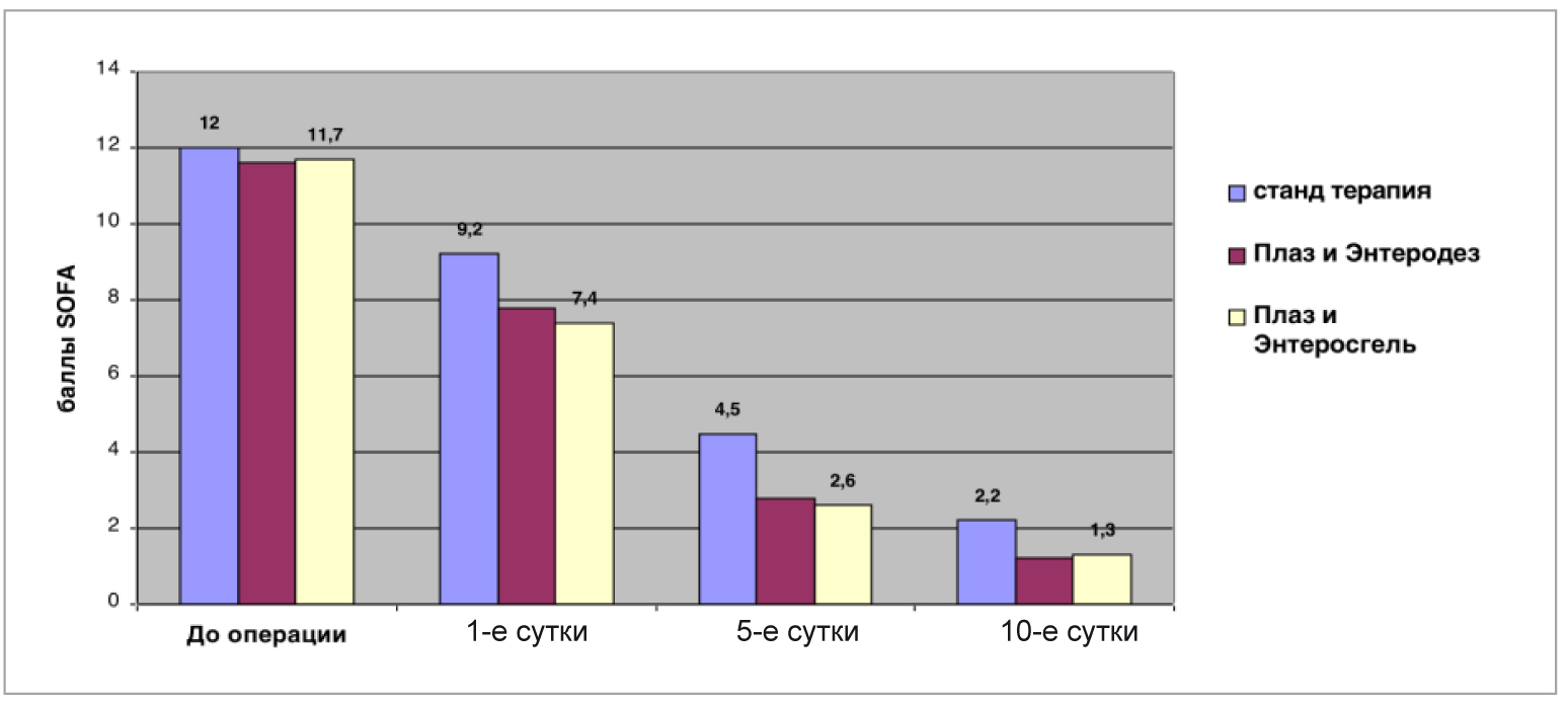 Сравнение эффектов включения NO-терапии аппаратом «Плазон» совместно с энтеросорбентами энтеродез и энтеросгель в программу санации брюшной полости у пациентов с разлитым гнойным перитонитом основной группы на показатели тяжести состояния больных выявило статистически достоверные различия у 12 пациентов, получавших обработку брюшной полости монооксидом азота (NO-терапия) аппаратом «Плазон» совместно с энтеросорбентами энтеродез и энтеросгель на 5-е и 10-е сутки послеоперационного периода по шкалам APACHE II и SOFA (p < 0,05), а по шкале SOFA комбинация энтеросгеля с NO-терапией аппаратом «Плазон» достоверно отличалась от значений контрольной группы начиная с 5-го дня после операции (табл. 1, рис. 1, 2).