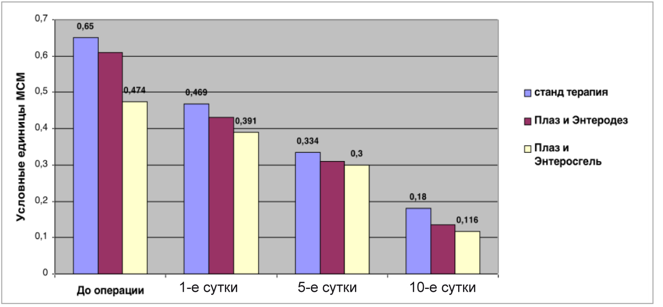 Рис. 4. Эффективность включения NO-терапии аппаратом «Плазон» совместно с энтеросорбентами в программу санации брюшной полости у пациентов с разлитым гнойным перитонитом по показателям интоксикации МСМ