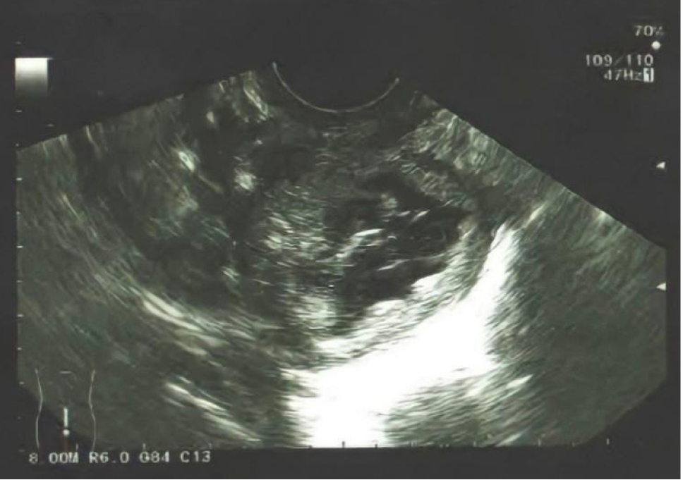 Пациентка К., 20 лет, обратилась к врачу-гинекологу с жалобами на боль во время полового акта и менструации. По результатам УЗИ (рис. 1): патологическое гетерогенное образование с ровными контурами и гипоэхогенным содержимым в позадиматочном пространстве, кровоток не регистрировался.
