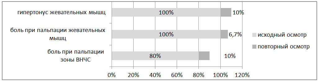 В группе 2 (30 человек) через 14–30 дней: наличие гипертонуса жевательных мышц снизилось до 10 % случаев, боли при пальпации жевательных мышц – до 6,7 %, зоны ВНЧС – до 10 % (рис. 2).