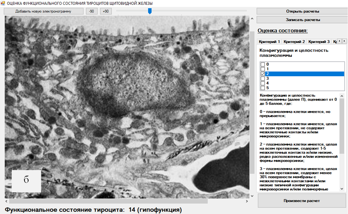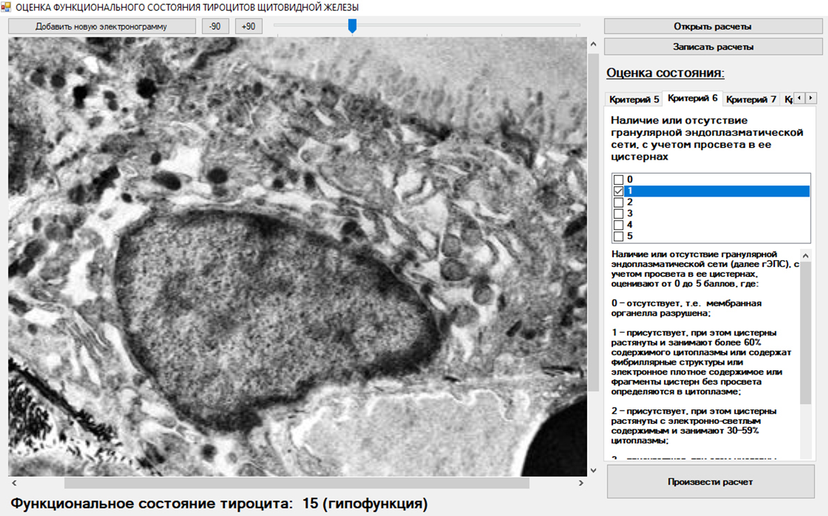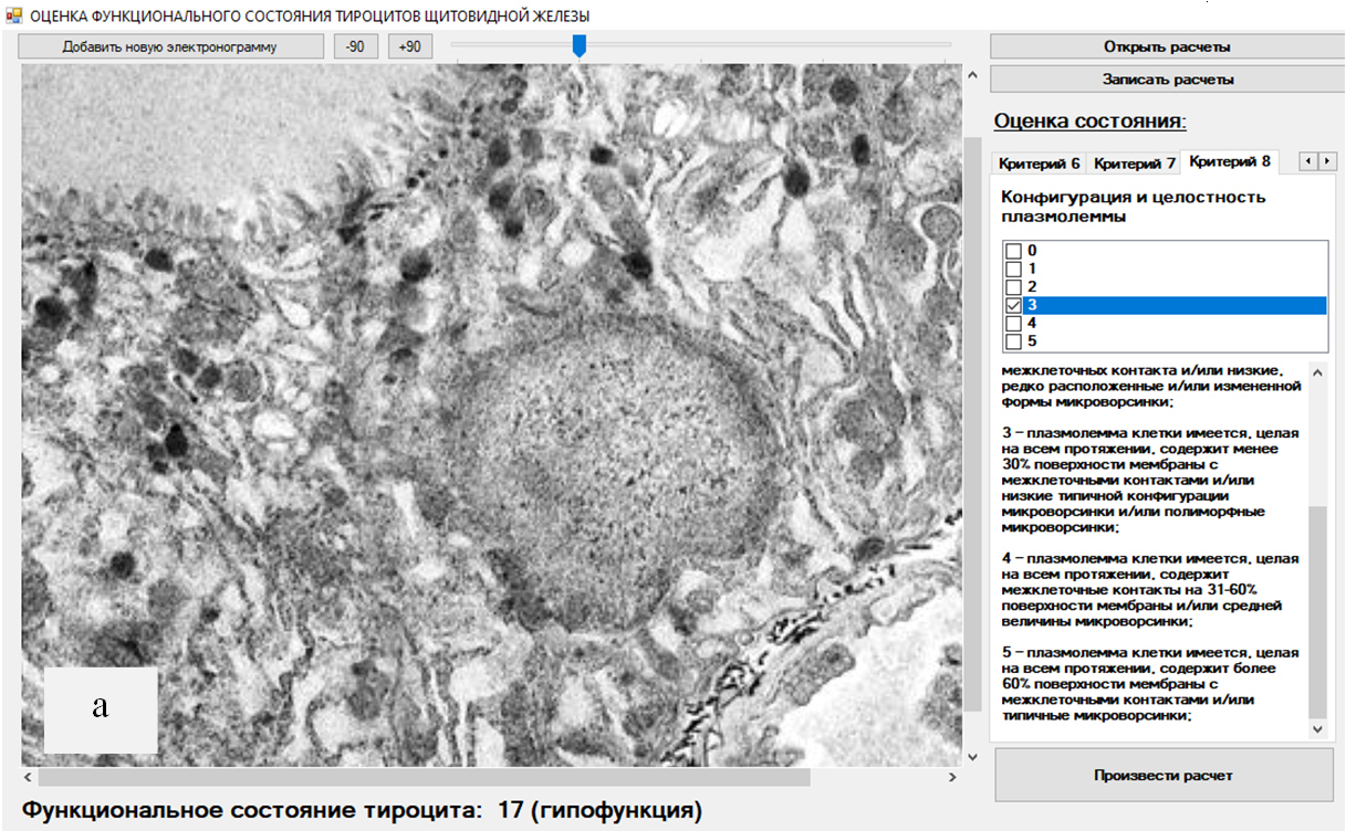Рис. 2. Снимок экрана с программой, позволяющей оценить функциональное состояние фолликулярного эндокриноцита в группе Ттр + Сн + Дфна 3-и сутки эксперимента (ув. на электронограмме ×8000)