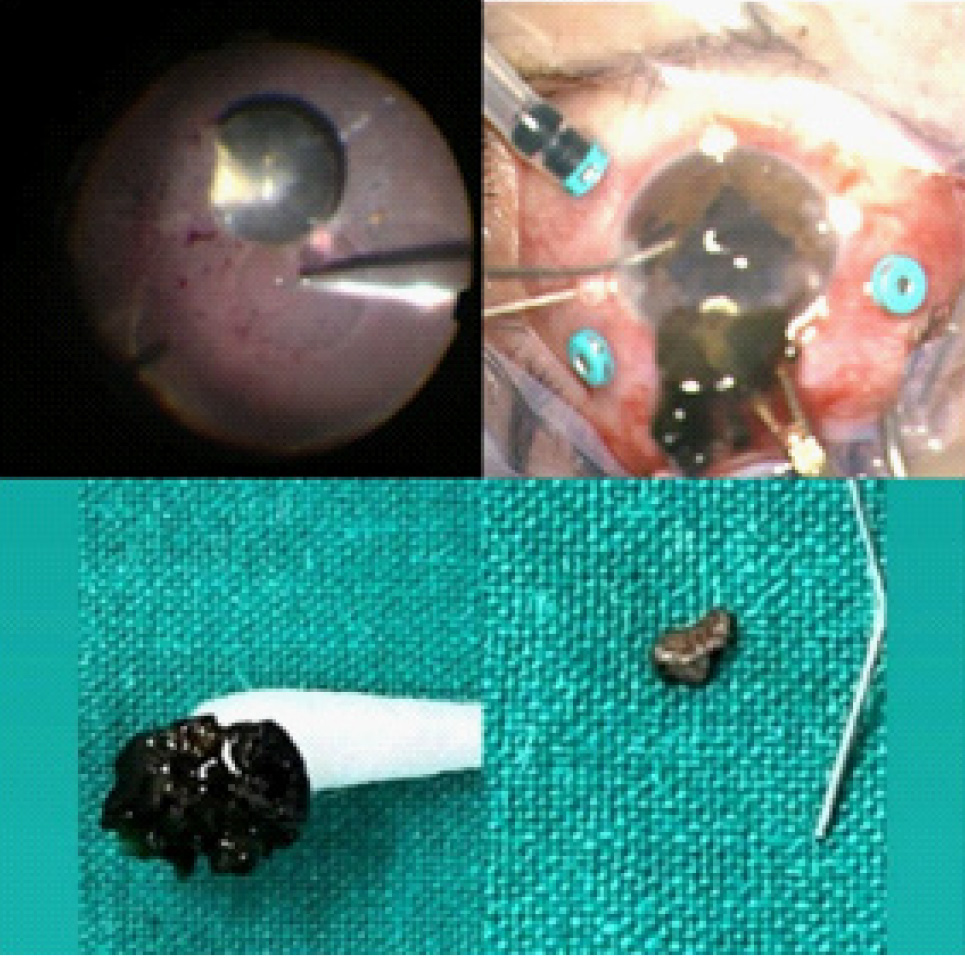 Рис. 7. Введение ПФОС; извлечение хрусталика; фото извлеченных хрусталика и ВГИТ