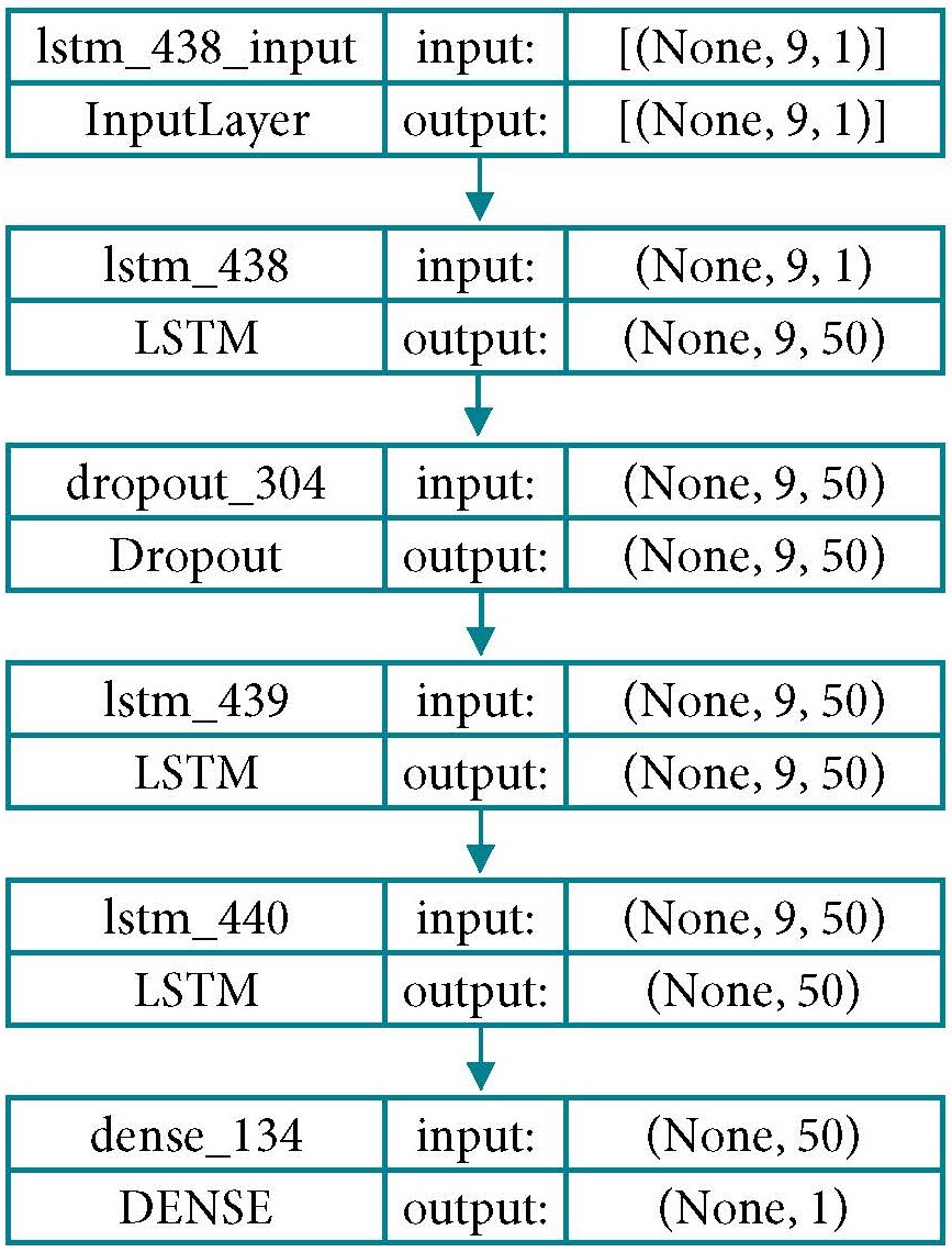 Как можно заметить, в представленной нейронной сети используется четыре LSTM-слоя, Dropout-слой после первого LSTM-слоя и плотный Dense-слой на выходе. Общее количество параметров составляет 50 851, все параметры были обучены, пропуски отсутствуют.