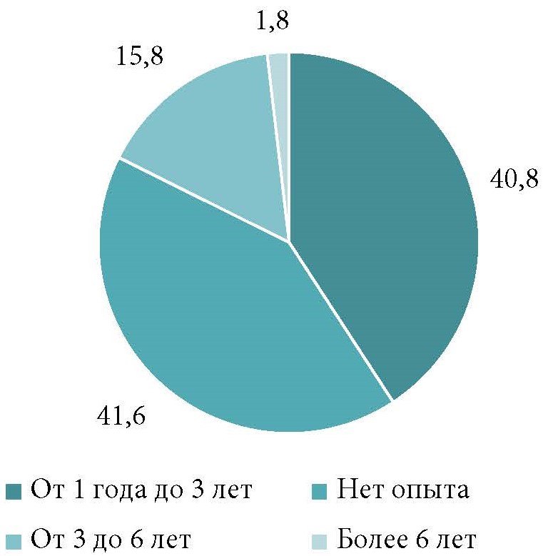 По опыту работы в вакансиях почти с равным соотношением требуются сотрудники как без опыта, так и с опытом от одного года до трех лет (42 и 40 % соответственно), при этом доля вакансий с необходимым опытом работы от трех до шести лет составила 16 %, более шести лет – только 2 % (рис. 2).
