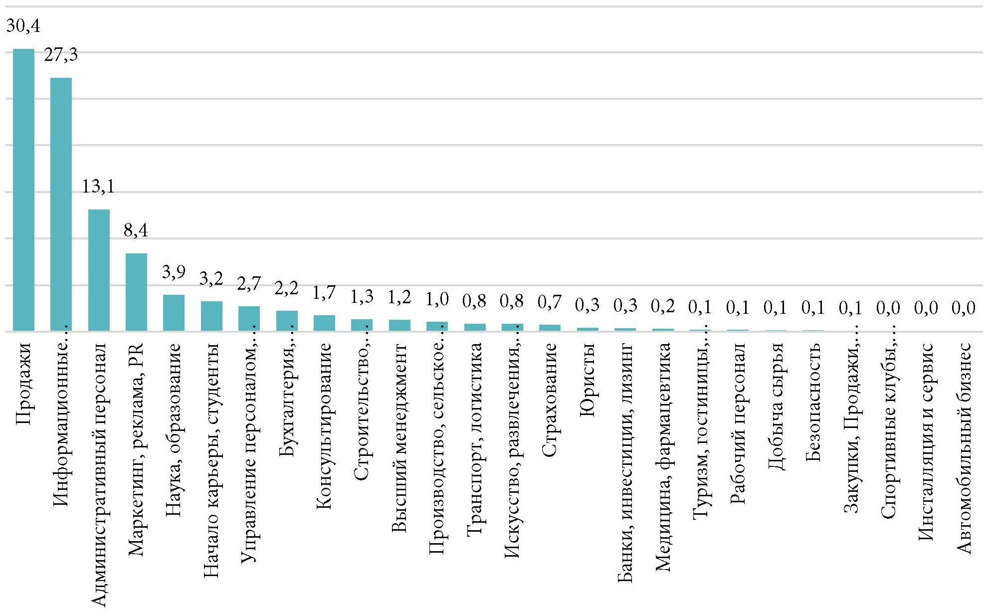 В разрезе профессиональных областей наибольшее количество вакансий приходится на продажи (30,27 %), затем – на ИТ (27,38 %), административный персонал (13,17 %), маркетинг, PR и рекламу (8,29 %), науку и образование (3,94 %) (рис. 4).
