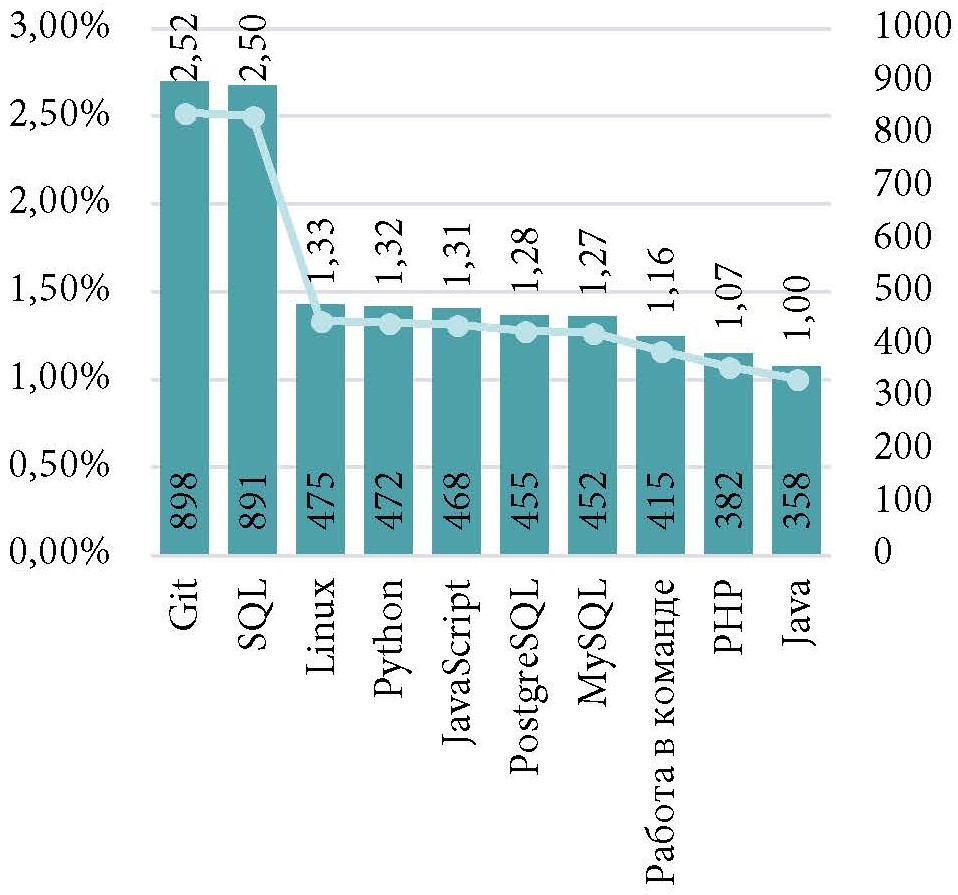 Результаты показали, что продвинутые цифровые навыки требуются преимущественно в ИТ-сфере и предполагают в подавляющем большинстве знание языков программирования: в пятерку наиболее востребованных вошли Git (2,52 %), SQL (2,5 %), Linux (1,33 %), Python (1,32 %), JavaScript (1,31 %) (рис. 5).