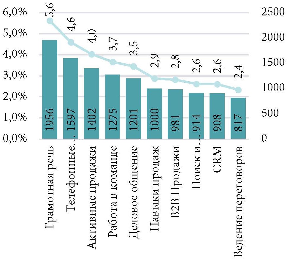 Рис. 7. Топ-10 востребованных навыков для области продаж, % от общего числа навыков для исследуемой области