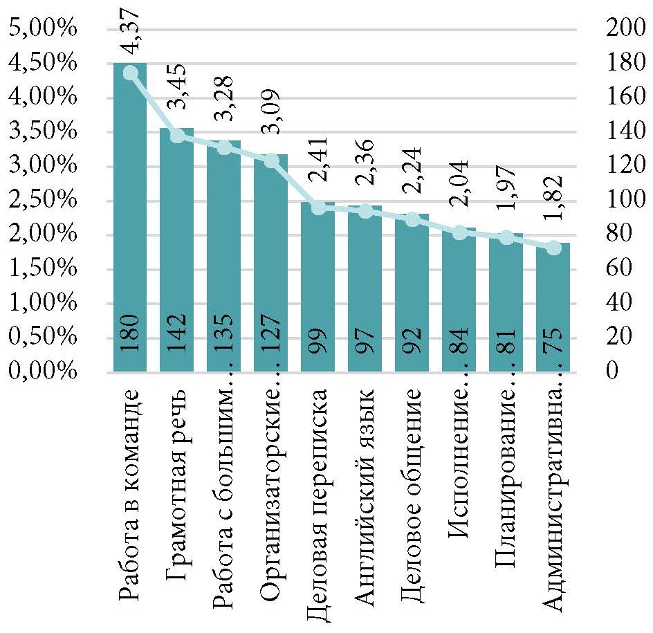 Рис. 8. Топ-10 востребованных навыков для области административного персонала, % от общего числа навыков для исследуемой области