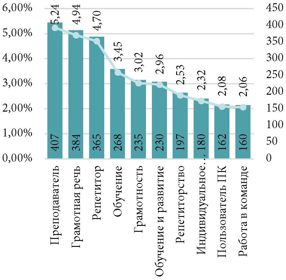 В науке и образовании чаще востребованы навыки: «преподавание» (5,24 %), «грамотная речь» (4,94 %), «репетиторство» (4,7 %), «обучение» (3,45 %), «грамотность» (3,03 %) (рис. 9).