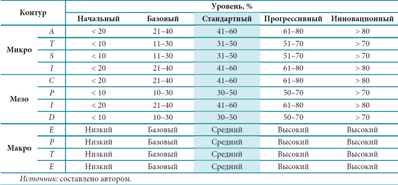 В табл. 4 представлена количественная характеристика метрик цифровой зрелости бизнеса в пределах микро-, мезо- и макроконтуров взаимодействия в соответствии с начальным, базовым, стандартным, прогрессивным и инновационным уровнями [7].