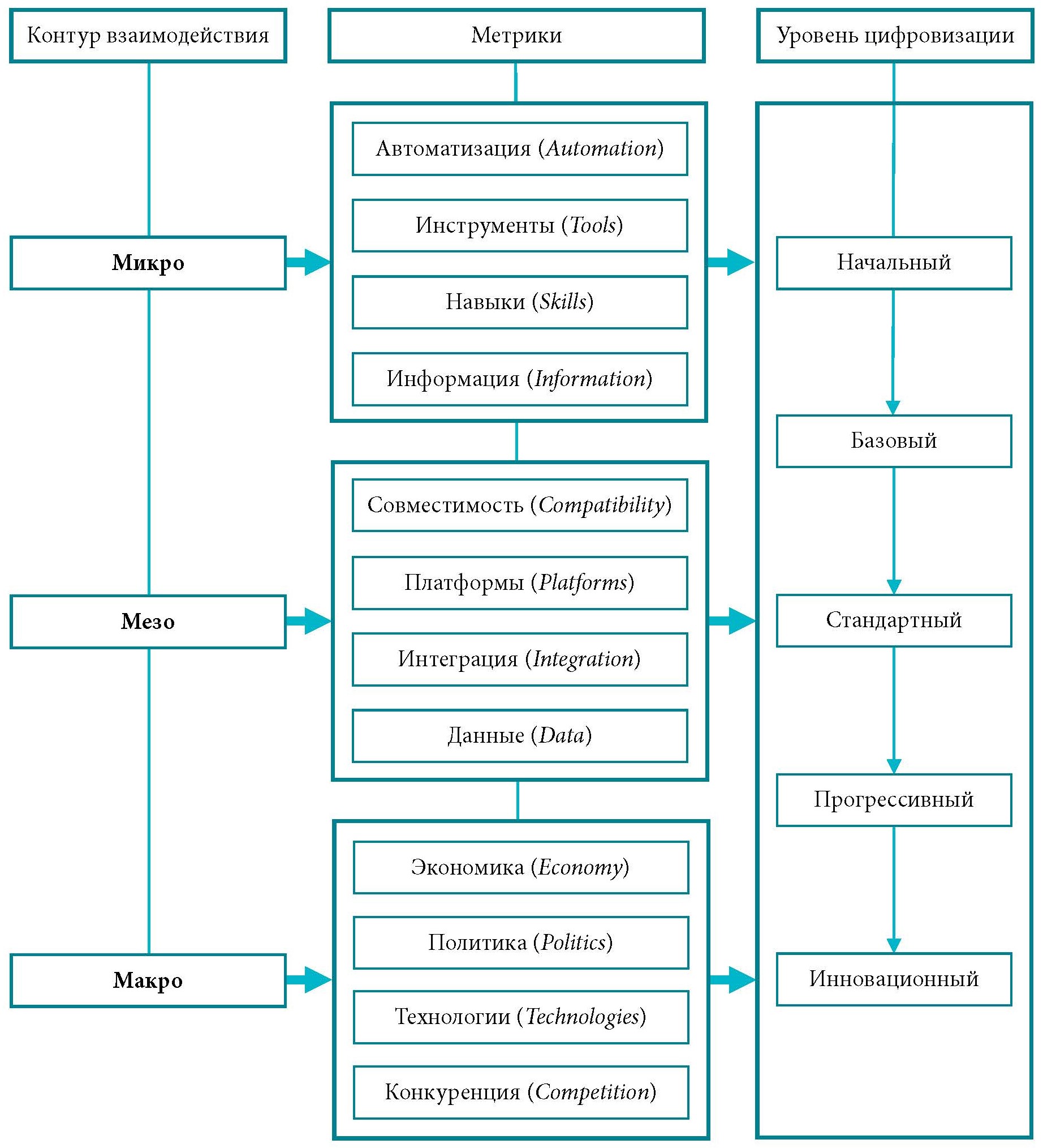 В основе настоящего исследования лежит структурная декомпозиция метрик цифровой зрелости бизнеса в пределах микро-, мезо- и макроконтуров организационного взаимодействия. Такой подход позволяет проводить измерение цифровой зрелости как отдельно в отношении каждого контура взаимодействия, так и комплексно, с возможностью разработки рациональной цифровой стратегии и в соответствии с соразмерностью инновационных изменений в каждом контуре.