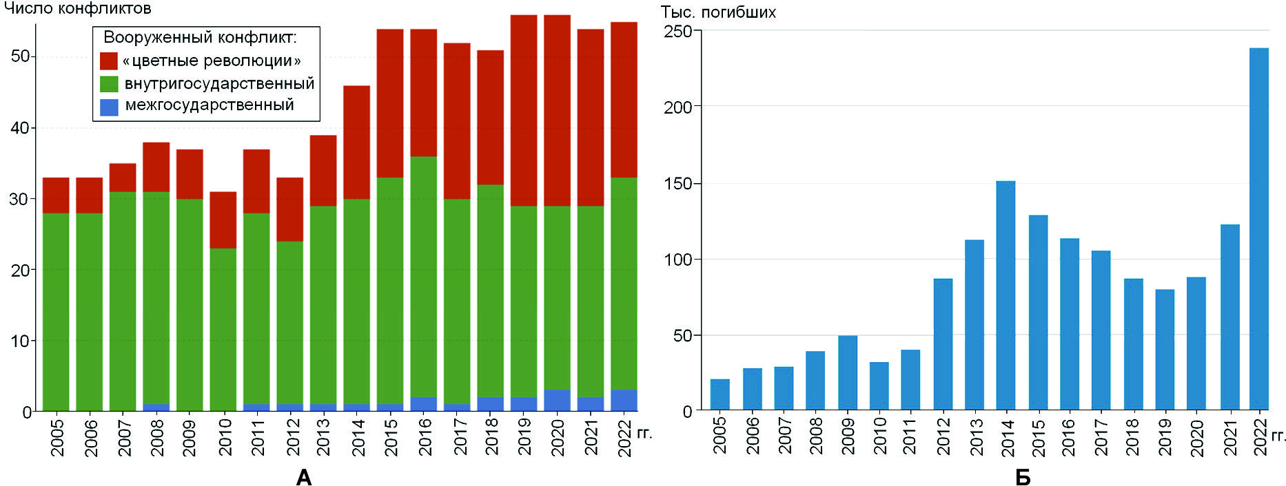Рис. 1. Число вооруженных конфликтов в мире (А), количество погибших в результате вооруженных конфликтов (Б) [адаптировано по Uppsala Conflict Data Program and Peace Research Institute Oslo, 2023].