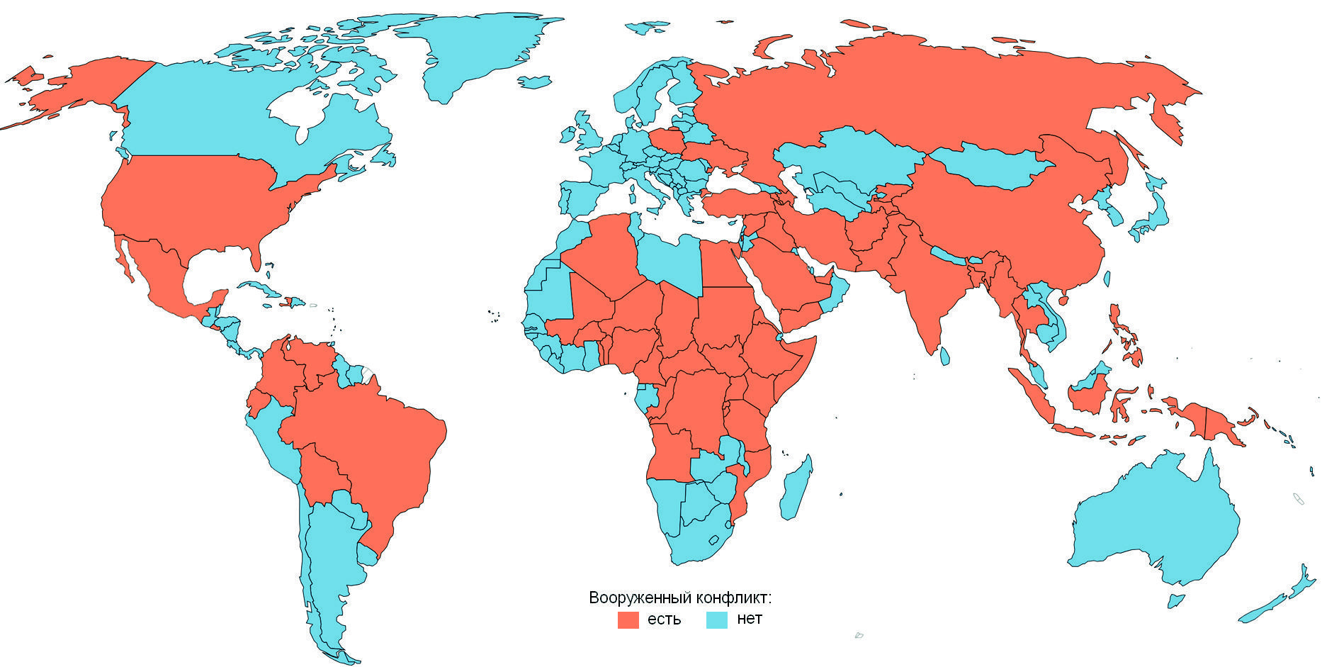 Самую большую долю составляют так называемые «интернационализированные» внутригосударственные конфликты («цветные» революции) с активным вмешательством иностранных государств, приводящие к дестабилизации в стране и смене политической элиты. По данным D. Shawn и соавт., в 2022 г. таких конфликтов было 22, когда одна или обе противоборствующие группировки внутри страны получали поддержку своих вооруженных сил от внешнего государства [16].