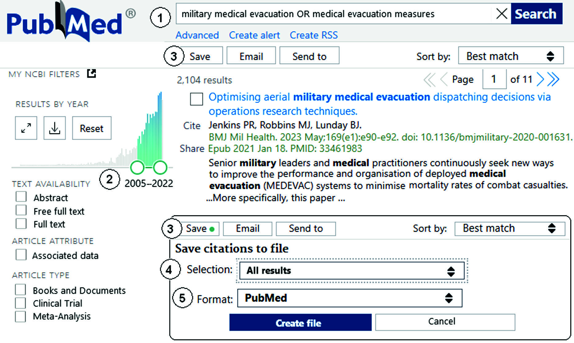 - поисковый запрос: «military medical evacuation OR medical evacuation measures» (рис. 3, п. 1), где OR – логический оператор объединения, обозначающий, что в найденных документах будет встречаться хотя бы один из соединенных терминов. В рубрикаторе медицинских терминов Medical Subject Headings (MeSH) используемых словосочетаний не оказалось. Поисковый запрос определился тем, что в зарубежных источниках, скорее всего, понятие «лечебно-эвакуационные мероприятия» используется редко, так как при рутинном просмотре статей чаще встречался термин «военно-медицинская эвакуация»;