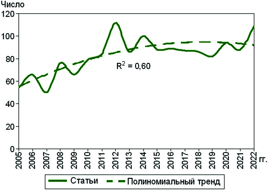 Динамика проанализированных научных статей представлена на рис. 4. Выявлен отчетливый интерес ученых к проблемам лечебно-эвакуационных мероприятий. Если в 2005 г. проиндексировано в PubMed 54 статьи, то в 2022 г. – 109, увеличение в 2 раза. Отмечается повышение публицистической активности в отдельные годы вследствие издания материалов, посвящённых анализу и обобщению опыта медицинского обеспечения знаковых в мире событий, таких как активные фазы боевых действий коалиционных сил НАТО в Ираке и Афганистане, авария на японской атомной электростанции «Фукусима-1», пандемия коронавирусной инфекции, а также начало специальной военной операции на Украине.