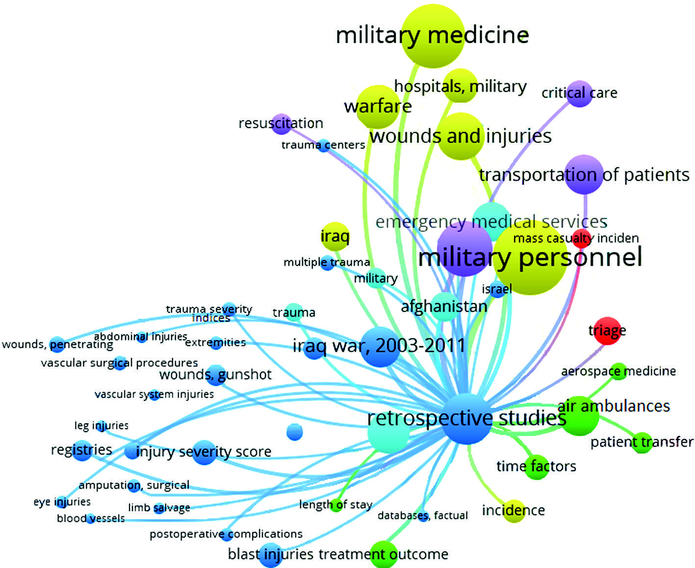 Retrospective studies/ретроспективные исследования Iraq war, 2003–2011/война в Ираке, 2003–2011 гг. Injury severity score/оценка тяжести травмы Blast injuries/взрывные травмы Registries/реестры Wounds, gunshot/ранения, огнестрельное ранение War-related injuries/травмы, связанные с войной Follow-up studies/последующие исследования Survival rate/процент выживаемости Wounds, penetrating/ранения, проникающие Сумма кластера | 280 (3,4) 175 (2,1) 66 (0,8) 64 (0,8) 45 (0,5) 47 (0,6) 49 (0,6) 33 (0,4) 26 (0,3) 27 (0,3) 1351 (16,3) | 3,5 2,4 1,0 0,9 0,8 0,7 0,6 0,5 0,4 0,4 18,7 |