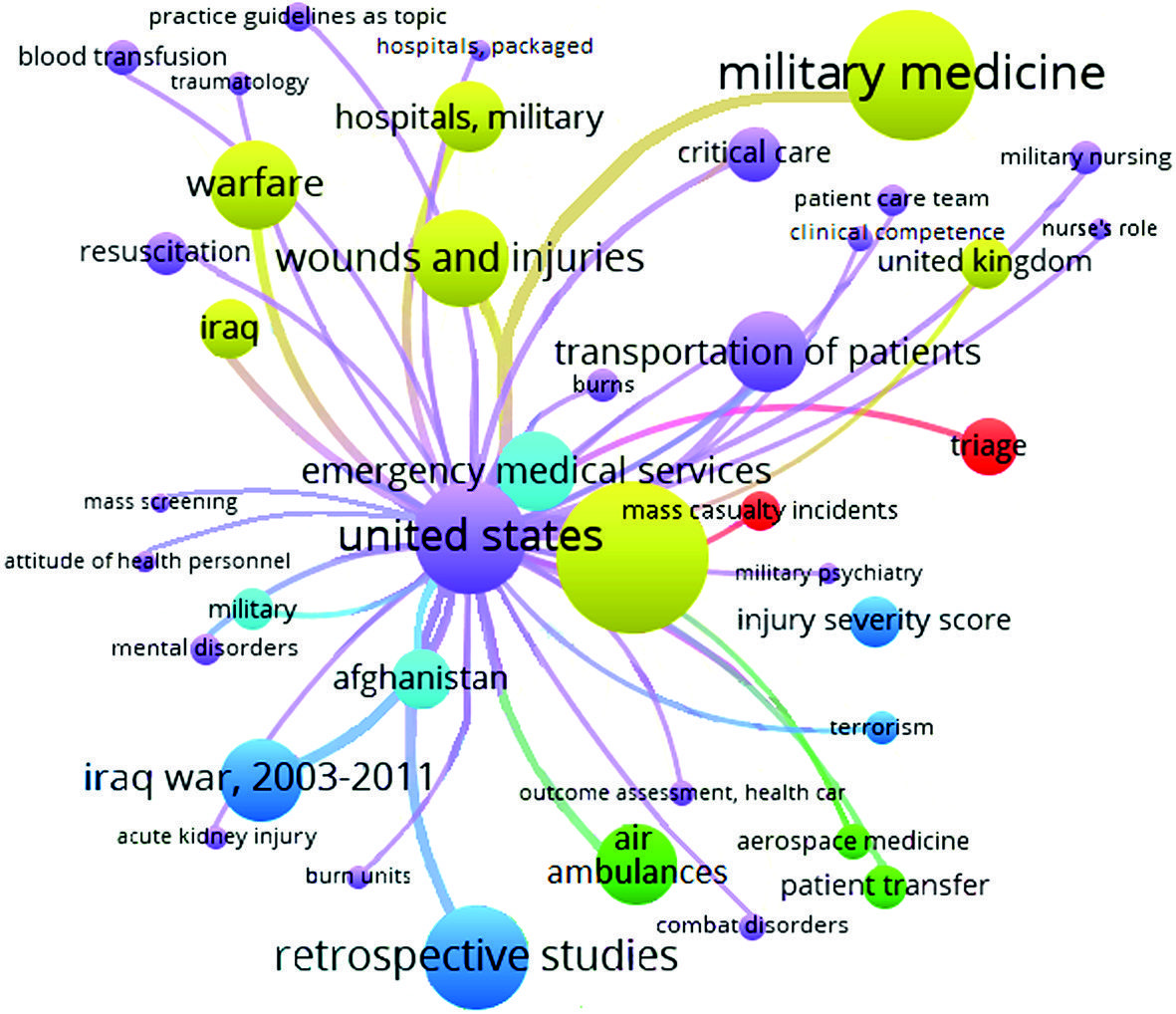 Методология. Изучили 1496 зарубежных статей, характеризующих организацию лечебно-эвакуационного обеспечения зарубежных армий и опубликованных в рецензируемых журналах, индексируемых в базе данных PubMed. Для кластерного анализа и визуализации ключевых слов статей использовали программу VOSviewer.