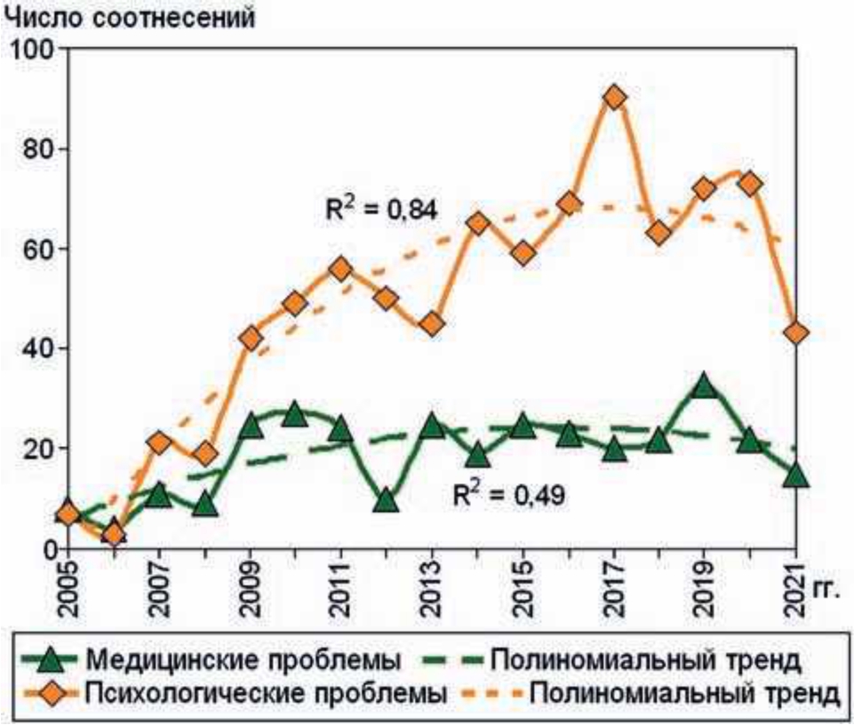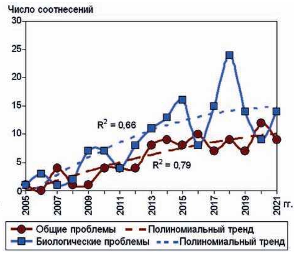 На рис. 6 изображена динамика количества статей, в которых исследовались общие вопросы боевого стресса и биологические проблемы, на рис. 7 – медицинские и социально-психологические проблемы. Полиномиальные тренды при высоких коэффициентах детерминации представляли увеличение данных (см. рис. 6, 7).