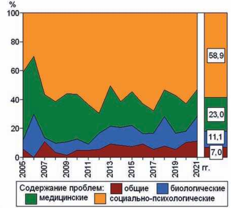 В структуре содержания статей доля общих проблем боевого стресса составила 7 %, биологических – 11,1 %, медицинских – 23 %, социально-психологических – 58,9 % (рис. 8). В динамике структуры содержания выявлено увеличение доли общих, биологических и социально-психологических проблем, уменьшение – медицинских проблем (см. рис. 8). Конгруэнтности (согласованности) трендов отраслей знаний по боевому стрессу – умеренные и статистически значимые (r = 0,52–0,73; p < 0,05–0,001), что указывает на влияние в развитии показателей одинаковых (однонаправленных) факторов.
