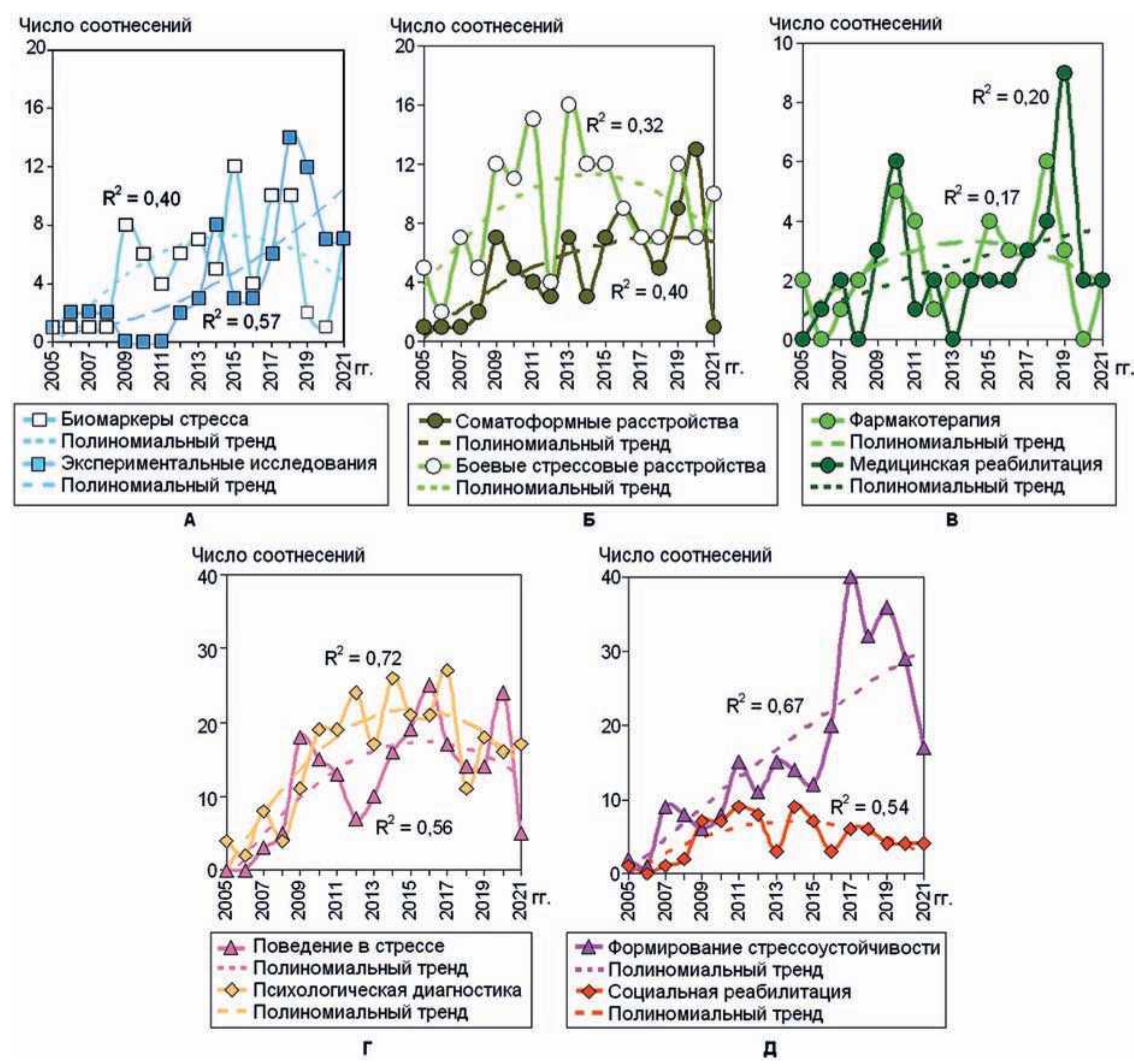 Среди медицинских проблем соматоформные расстройства, возникающие в результате боевого стресса, изучались в 6,1 % публикаций, боевые стрессовые расстройства (острое стрессовое расстройство, посттравматическое стрессовое расстройство и пр.) – в 10,9 %, фармакотерапия, психофармакотерапия – в 3,1 %, медицинская реабилитация лиц опасных профессий – в 2,9 %. При низких коэффициентах детерминации полиномиальные тренды статей с изучением соматоформных расстройств при боевом стрессе (см. рис. 9Б) и медицинской реабилитации пострадавших (см. рис. 9В) демонстрировали тенденцию увеличения данных, боевых стрессовых расстройств (см. рис. 9Б) и фармакотерапии (психофармакотерапии) (см. рис. 9В) напоминали инвертированную U-кривую с уменьшением данных в последний период наблюдения.