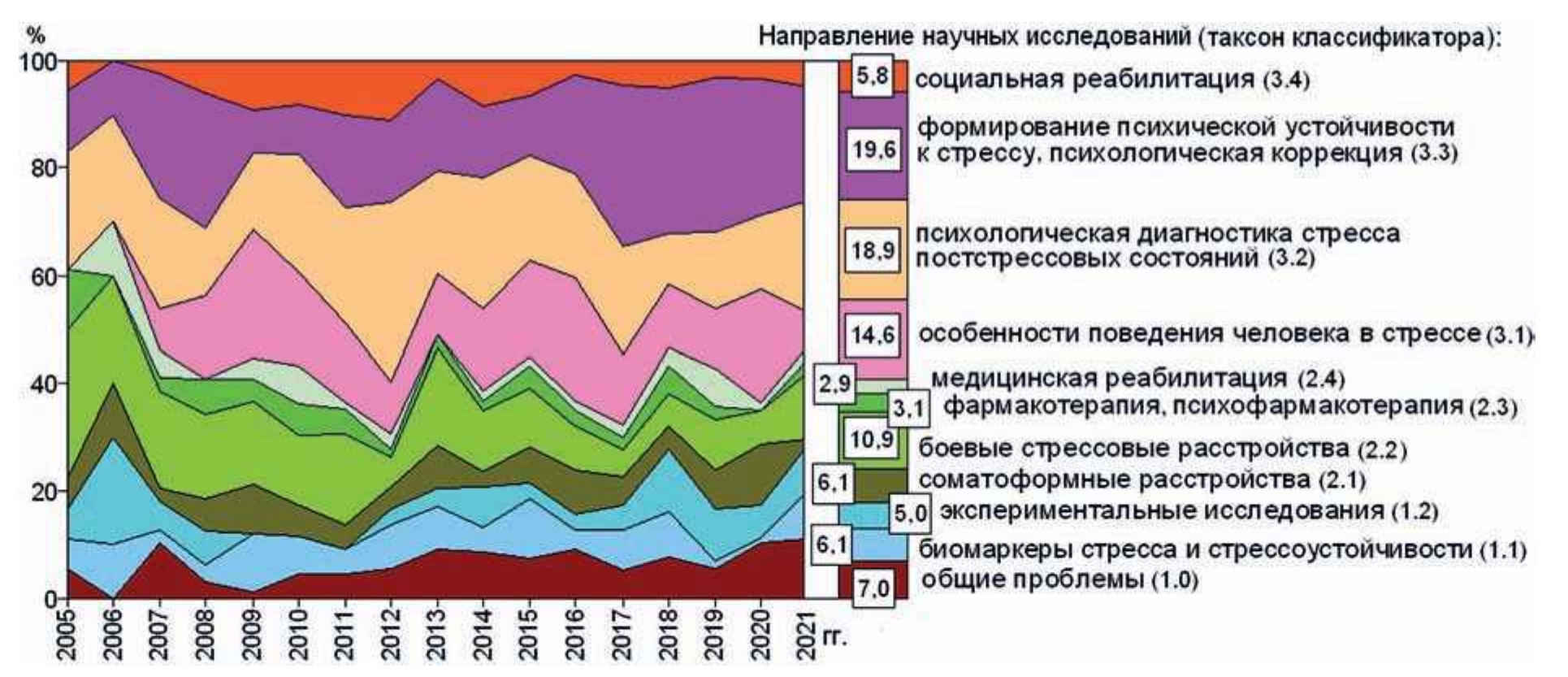 В динамике структуры отмечается тенденция увеличения доли публикаций, в которых изучались вопросы экспериментальных исследований стресса на животных (таксон классификатора – 1.2, см. табл. 1), особенностей поведения человека в стрессе (3.1), формирования психической устойчивости к стрессу, психологической коррекции и психотерапии (3.3), уменьшение доли статей с биомаркерами стресса и стрессоустойчивости у человека (1.1), с медицинскими проблемами (2.1, 2.2, 2.3 и 2.4), с психологической диагностикой стресса, постстрессовых состояний и нарушений адаптации (3.2), с социальной реабилитацией и ресоциализацией участников вооруженных конфликтов и мирного населения (3.4) (рис. 10).