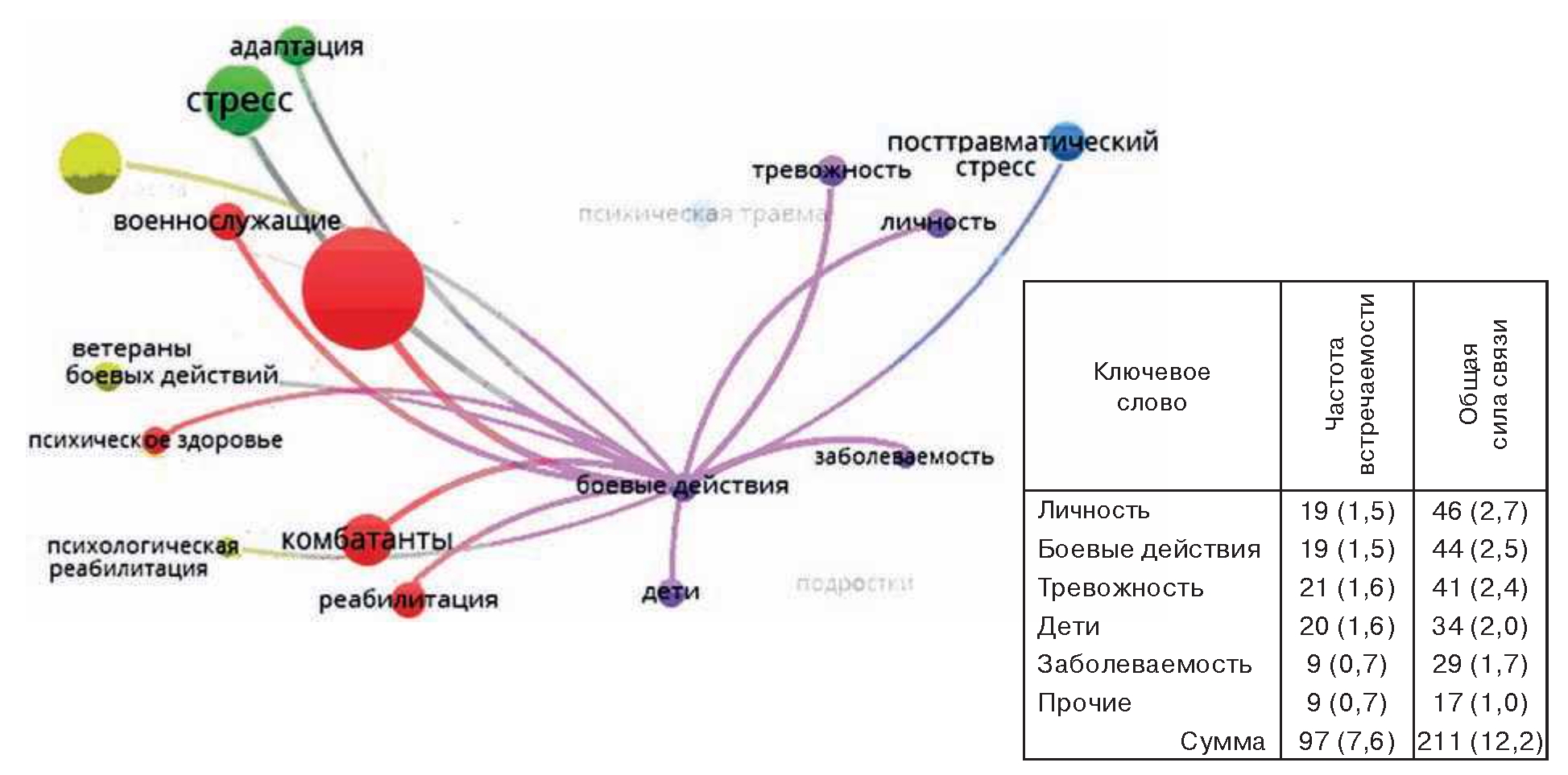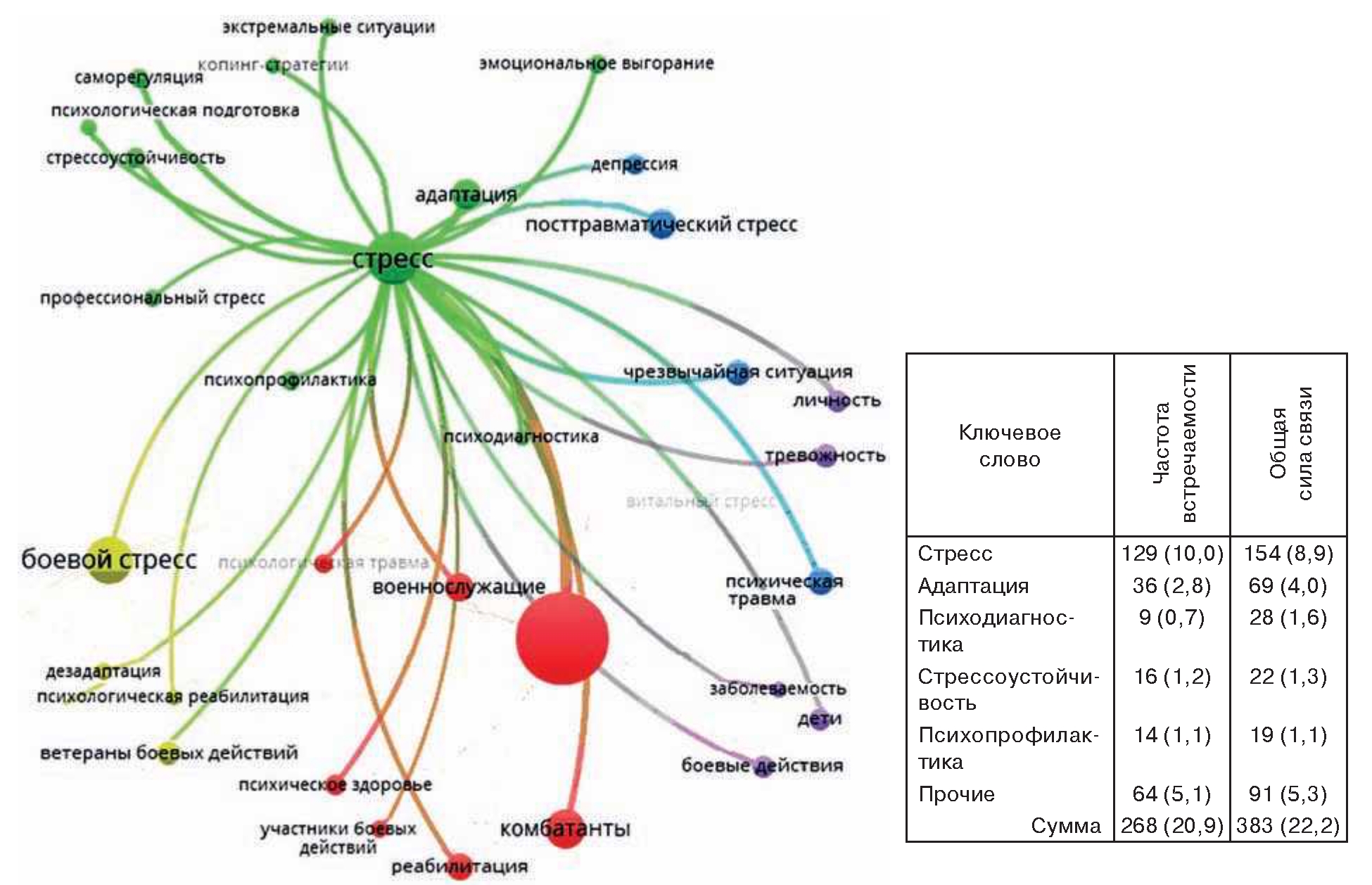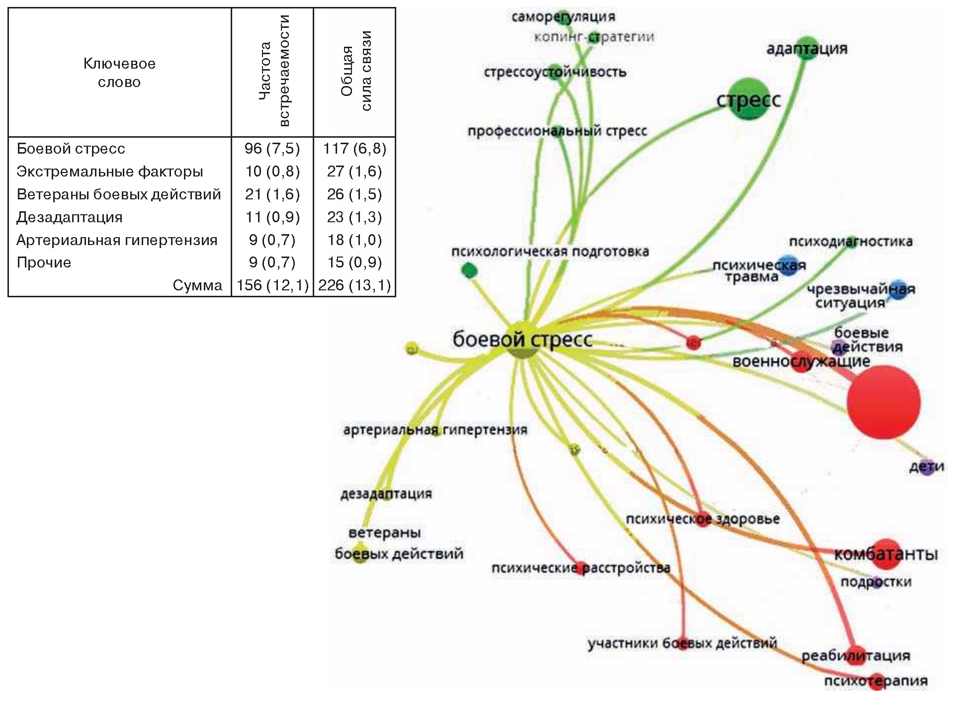 Results and discussion. Annually, fifty-seven 57 [44; 64] papers on combat stress published in Russia were indexed. The distribution by research field included general combat stress problems issues – 7 %, biological aspects – 11.1 %, medical aspects – 23 %, social and psychological aspects – 58.9 %. Content structure dynamics revealed an upward trend in the number of papers devoted to general, biological, social and psychological problems, with a decrease in the number of papers on medical issues. With 9 repetitive key words or 4 repetitive authors, VOSviewer software identified 5 clusters of papers and 11 academic co-authorships. Cluster 1 included a set of papers on combat stress disorder with Total Link Strength of 40.1 %, cluster 2 – social and psychological problems of combat stress (22.2 %), cluster 3rd – psychosomatic disorders in combat veterans (13.1 %), cluster 4 – human behavior in extreme environments (12.4 %), cluster 5 – stress manifestations in civilians during combat operations (12.2 %).