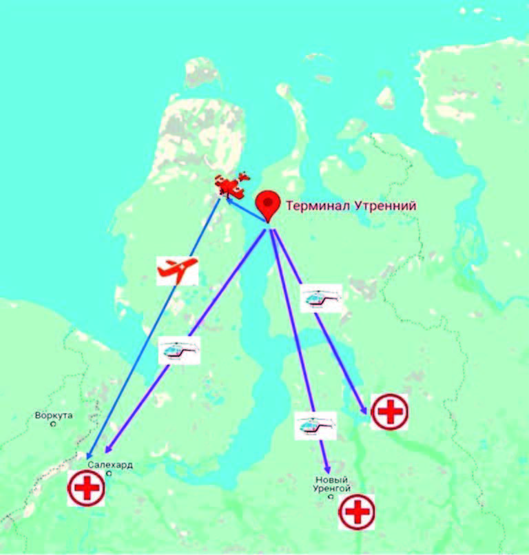 От строительной площадки до аэропорта, расположенного в пос. Утренний, медицинская эвакуация проводится автомобильным санитарным транспортом, далее, в зависимости от погодных условий, – вертолетом или самолетом. В случае нормальных погодных условий экстренная медицинская эвакуация осуществляется санитарным вертолетом до Тазовской ЦРБ или Новоуренгойской ЦРБ, либо в Салехардскую ОКБ. Если погода нелетная только для вертолета, то для экстренной медицинской эвакуации используется малая авиация (самолет АН-24) – авиамедицинская эвакуация в этом случае осуществляется в аэропорт Сабетта, где имеется возможность приема всех типов самолетов и вертолетов. Из аэропорта Сабетта возможна дальнейшая авиамедицинская эвакуация пациентов как в клиники ЯНАО (г. Новоуренгой, г. Салехард), так и на большую землю, чаще всего в Москву или г. Тюмень. В случае, если погода для всех типов авиации (и вертолетов, и самолетов) нелетная, пациент остается под медицинским наблюдением в палате интенсивной терапии врачебного здравпункта 3-го уровня до нормализации погодных условий и появления возможности вылета. Плановая авиационная медицинская эвакуация осуществляется до аэропорта Сабетта, а оттуда – в Москву.