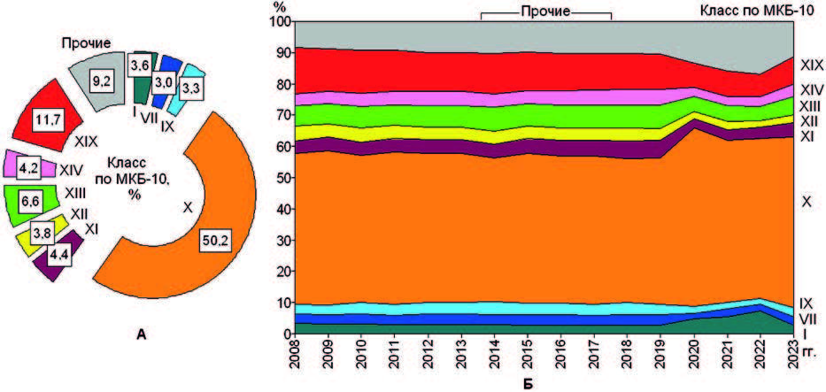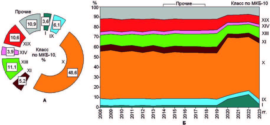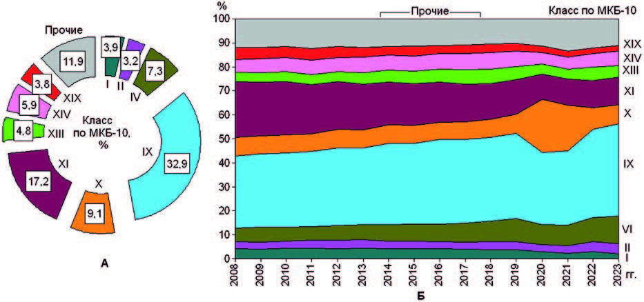 При анализе болезней по МКБ-10 акцент делали на классы, показатели которых имели вклад в структуру не менее 3 %, отдельных болезней (групп в классах) – не менее 0,1 %.