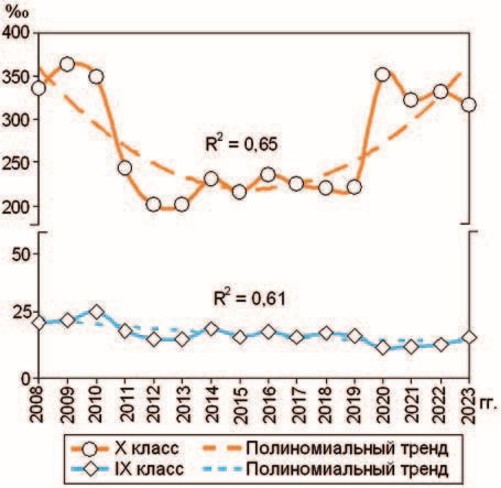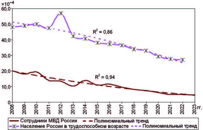 Результаты и их анализ. Среднемноголетний показатель общей заболеваемости составил 857,1 ‰, средний – (868,5 ± 35,7) ‰, первичной заболеваемости – 545,7 ‰ и (553,6 ± 27,5) ‰, нуждаемости в диспансерном наблюдении –123,8 ‰ и (125,9 ± 7,5 ‰), случаев трудопотерь – 572,4 и (576,1 ± 28,5 )‰, дней трудопотерь – 7398 ‰ (7506 ± 391 ‰), первичной инвалидности – 10,9 • 10–4 и (11,1 ± 1,3) • 10–4, смертности – 90,1 • 10–5 и (92,4 ± 9,9) • 10–5. При высоких коэффициентах детерминации полиномиальные тренды общей заболеваемости, первичной инвалидности и смертности показывают уменьшение данных, первичной заболеваемости, случаев и дней трудопотерь напоминают U-кривую с увеличением показателей за счет случаев заболеваемости COVID-19 в 2020–2022 гг. Основными классами болезней, обусловивших социально-эпидемиологическую значимость заболеваемости личного состава МВД России, были показатели травм, отравлений и некоторых других последствий воздействия внешних причин (XIX класс) с долей 24,6 %, болезней органов дыхания (X класс) – 20,3 %, системы кровообращения (IX класс) – 18,7 %, новообразований (II класс) – 6,8 %, болезней костно-мышечной системы и соединительной ткани (XIII класс) – 6,5 %, органов пищеварения (XI класс) – 5,7 %. В сумме указанные классы болезней составили 82,3 % от всей социально-эпидемиологической значимости заболеваемости.