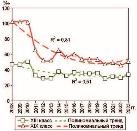 На рис. 28, 29 показана динамика смертности сотрудников по ведущим классам болезней. При высоких коэффициентах детерминации полиномиальные тренды уровней смертности от новообразований (II класс) и травм, отравлений и некоторых других последствий воздействий внешних причин (XIX класс) демонстрировали снижение показателей, от болезней системы кровообращения (IX класс) и органов пищеварения (XI класс) – напоминали U-кривые с увеличение показателей в последний период наблюдения.