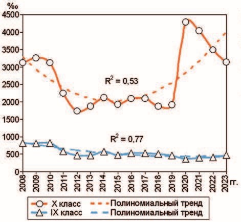 Динамику показателей оценивали с помощью анализа динамических рядов и расчета полиномиального тренда второго порядка [15]. Коэффициент детерминации (R2) показывал связь построенного тренда с данными, чем больше был R2 (максимальный 1,0), тем больше приближался он к объективным данным. Значок ↑ в таблицах показывает тенденцию роста динамики данных, ↓ – уменьшение, → – стабильности, – U-кривую, – инвертируемую U-кривую. В ряде случаев правый край тренда был больше (меньше) левого, в этом случае к U-кривой добавляли знаки ↑(↓).