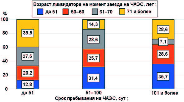 Средний срок длительности пребывания в зоне составил (45,1 ± 3,4) сут. Минимальный срок составил 1 сут и максимальный – 231 сут. 25 % ликвидаторов аварии находились в зоне аварии до 16 сут, 50 % – от16 до 62, 25 % – свыше 62 сут. По сроку пребывания на ЧАЭС ликвидаторов распределили на группы: