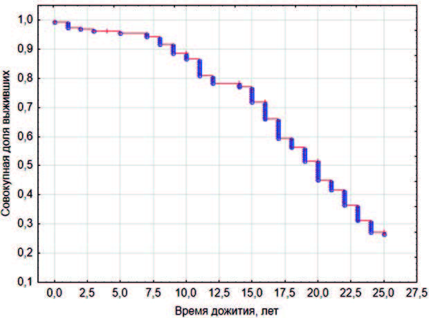 Функция 25-летнего дожития, приведенная в табл. 2 и на рис. 2, показывает, что в первые 10 лет ежегодно уходили из жизни от 0,7 до 6 % наблюдавшихся ликвидаторов, к 10-му году – в живых осталось около 88 %. Начиная с 11-го года, интенсивность ежегодной смертности увеличилась с 3 до 17 %, к 20-м годам после аварии в живых осталось 51,6 %. К завершению срока наблюдения в живых было только 27,2 %. При этом медиана (50 %) дожития составила не многим более 20 лет, а верхний квартиль (25 %) – около 15 лет.