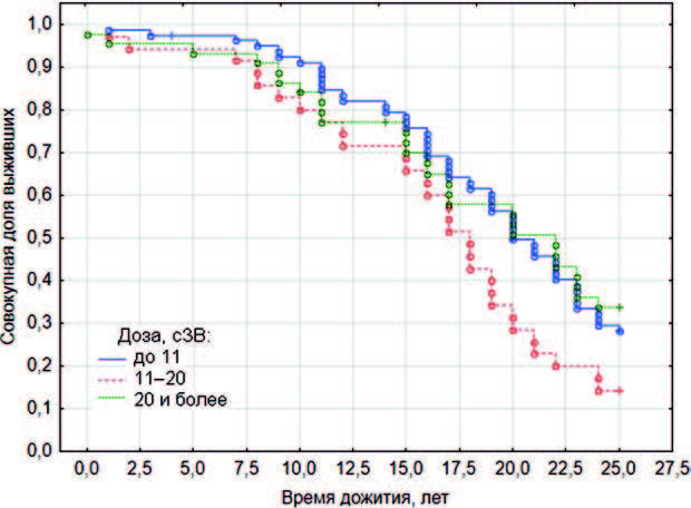 Доза облучения (табл. 3) не оказала статистически значимого влияния (p = 0,12) на функции дожития ликвидаторов. Так, ликвидаторы, у которых накопленная доза составила до 11 и 21 сЗв и более, уходили из жизни практически с одинаковой интенсивностью в течение всего периода наблюдения. Из числа ликвидаторов с накопленной дозой до 11 сЗв в живых осталось 29,5 %, а с дозой 21 сЗв и более – 33,8 %. Из числа ликвидаторов, облучение которых составило от 11 до 20 сЗв, дожили только 14,3 %. Интенсивность их ухода существенно увеличилась после 15-го года наблюдения. Наглядно кривые дожития показаны на рис. 3.