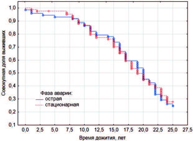 Показатели продолжительности жизни ЛПА не зависели ни от фазы аварии на станции (χ2 = 3,9; р < 0,27), ни от вида работ на объекте (χ2 = 6,8; р < 0,77).