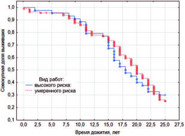 Рис. 7. Функции 25-летнего дожития ЛПА на ЧАЭС в зависимости от вида выполняемых работ (р = 0,42).