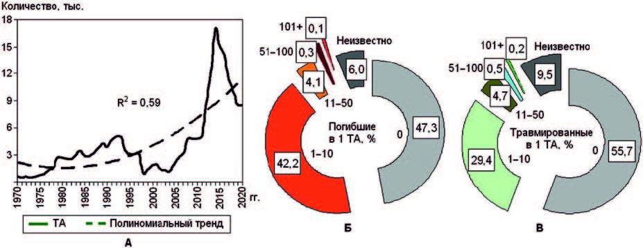 На рис. 2 показана динамика количества ТА в мире. Полиномиальный тренд при значимом коэффициенте показывает рост террористической активности в мире (см. рис. 2А), притом что в последнее пятилетие число ТА уменьшается. На рис. 2Б, В показана структура погибших и получивших травмы в 1 ТА из учтенных 209,7 тыс. ТА в 1970–2020 гг. Оказалось, что в 47,3 и 55,7 % о погибших и травмированных в ТА не отмечалось, а в 6 и 9,5 % ТА о числе пострадавших было неизвестно. Оказалось, что в 208 (0,1 %) ТА погибли 100 человек и более, в 408 (0,2 %) ТА аналогичное количество людей получили травмы.