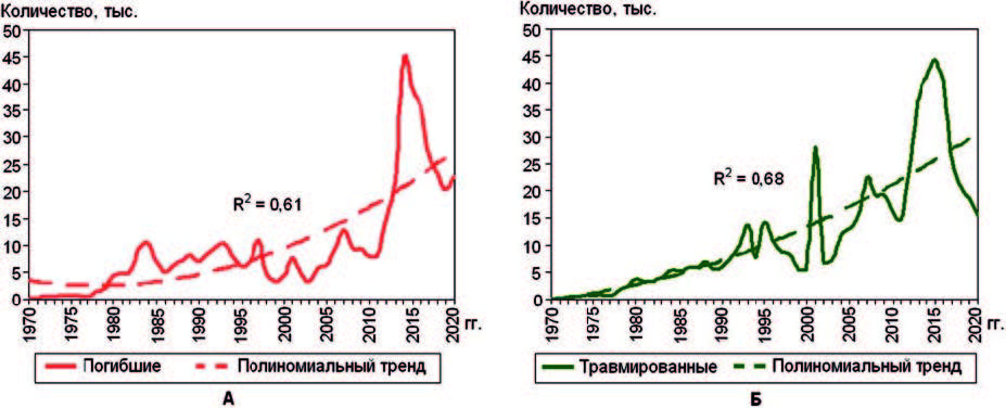На рис. 3 показана динамика количества погибших и получивших травмы во всех ТА. Полиномиальные тренды при высоких коэффициентах детерминации общего количества погибших (см. рис. 3А) и получивших травмы (см. рис. 3Б) показывают увеличение данных. Если из общего количества всех ТА вычесть инциденты без медико биологических последствий и неизвестные (см. рис. 2), то в 1 ТА при терроризме погибали 5 человек и травмировались 8. Если предположить, что в ТА, которые идентифицированы с неизвестным числом погибших, распределение жертв было таким же, как и в общем массиве ТА с медико-биологическими данными, т.е. к полученной сумме прибавить и эти ТА, то число погибших в 1 ТА будет 4,3, травмированных – 6,3.