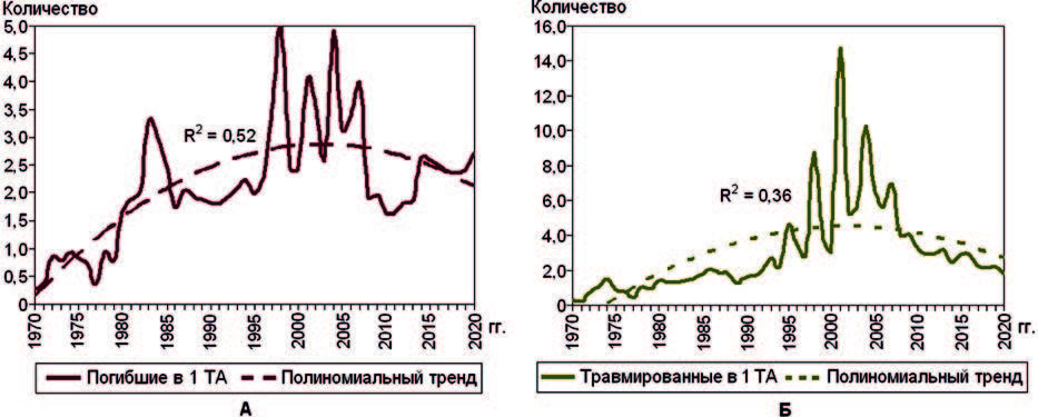На рис. 4 показана динамика погибших и получивших травмы в 1 ТА в 1970–2020 гг. Полиномиальные тренды при разных по значимости коэффициентах детерминации демонстрируют инвертированные U-кривые с уменьшением показателей в последний период наблюдения. В 1998–2007 гг. была относительно невысокая террористическая активность в мире (см. рис. 3) и, в то же время, именно в этот период отмечалось самое большое количество погибших и получивших травмы в расчете на 1 ТА (см. рис. 4А, Б).
