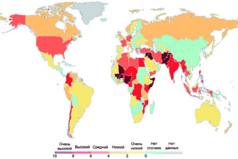 - с высоким – 8: Индия (7,60), Сомали (7,55), Сирия (7,05), Йемен (6,95), Филиппины (6,89), Демократическая Республика Конго (6,66), Таиланд (6,49) и Колумбия (6,15);