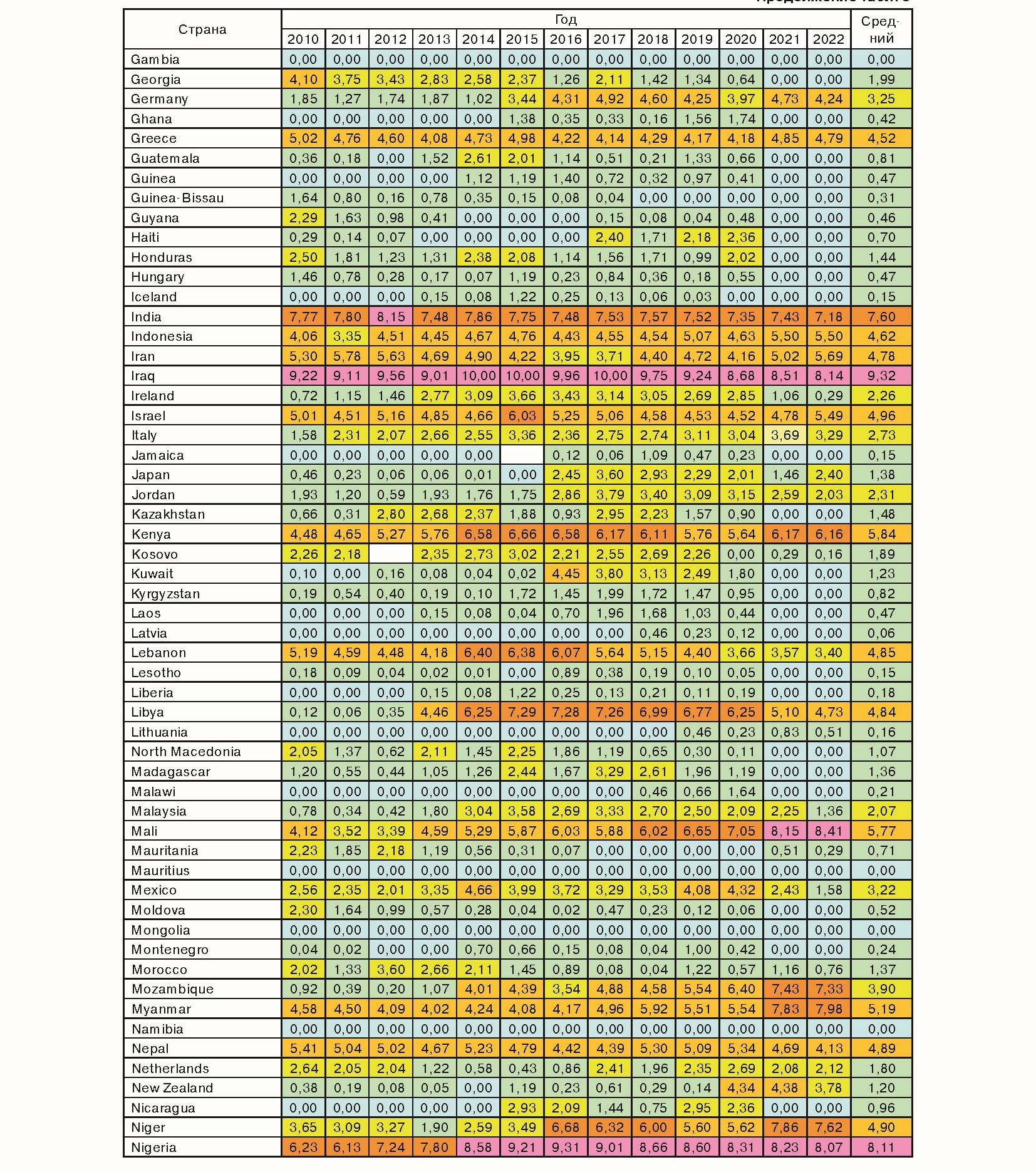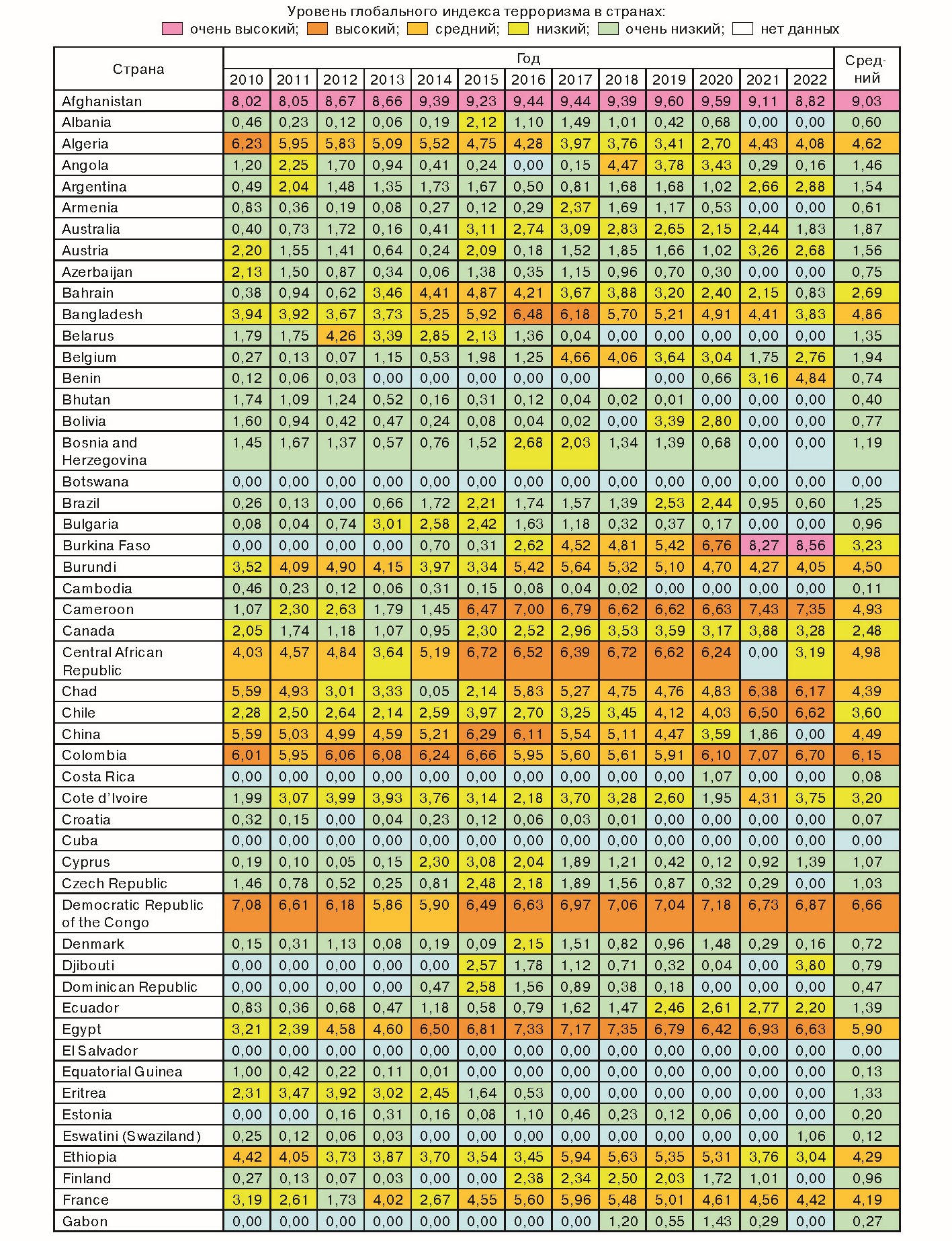 Показатели GTI за 13 лет c 2010 по 2022 г. суммировали и вычислили средние по 163 странам мира, которые в табл. 3 представлены в алфавитном порядке. По среднему показателю GTI оказалось, что в мире стран было: