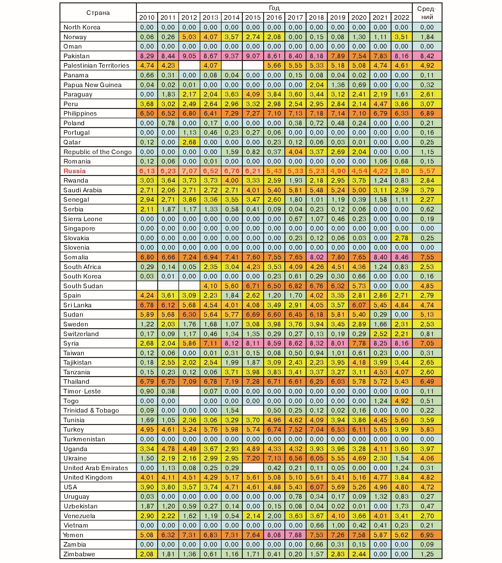 - со средним – 30 стран: Египет (5,90), Турция (5,83), Россия (5,57), Израиль (4,98), Великобритания (4,82), США (4,72), Китай (4,49), Франция (4,19) и др.;