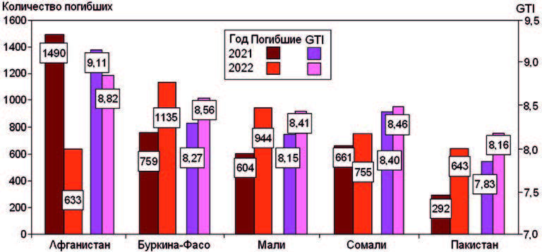 Уровень погибших в Афганистане составил в 2021 г. 20,4 % от всех погибших при ТА в мире, в 2022 г. – 9,4 %, GTI – 9,11, 8,82 соответственно, в Буркина-Фасо погибшие составили 10,4 и 16,9 %, GTI – 8,26 и 8,56 соответственно, в Мали – 8,3 и 14,1 %, GTI – 8,15 и 8,41 соответственно, в Сомали – 9,0 и 11,3 %, GTI – 8,40 и 8,46 соответственно, в Пакистане – 4,0 и 9,6 %, GTI – 7,83 и 8,16 соответственно. Даже внешне отмечается одинаковая направленность числа погибших и данных GTI (рис. 6). Корреляционная зависимость показателей – положительная, сильная и статистически достоверная (r = 0,799; p < 0,01).