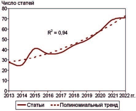 Поиск позволил найти 484 отклика на зарубежные статьи (см. рис. 1В). Полиномиальный тренд при очень высоком коэффициенте детерминации (R2 = 0,94) показывал увеличение данных. Рутинным способом просмотрели найденные статьи и исключили поисковый шум, который составил 5,4 %. На рис. 2 показана динамика проанализированных 458 статей. Среднегодовой показатель был 46 статей, медиана с квартилями (Me[Q1; Q2]) – 43 [36; 58] статей.